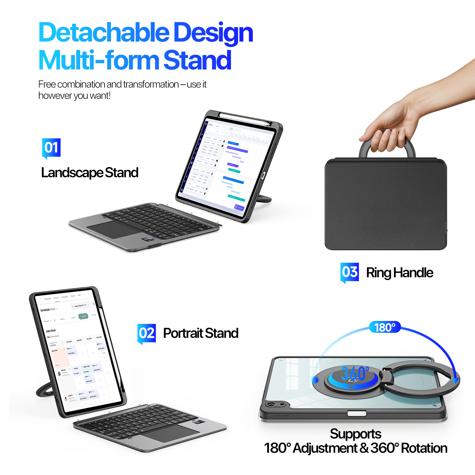 - Versatile Support Detachable keyboard and case with 360 degree rotating stand and 180 degree angle adjustment, supporting both landscape and portrait orientations for flexible use.