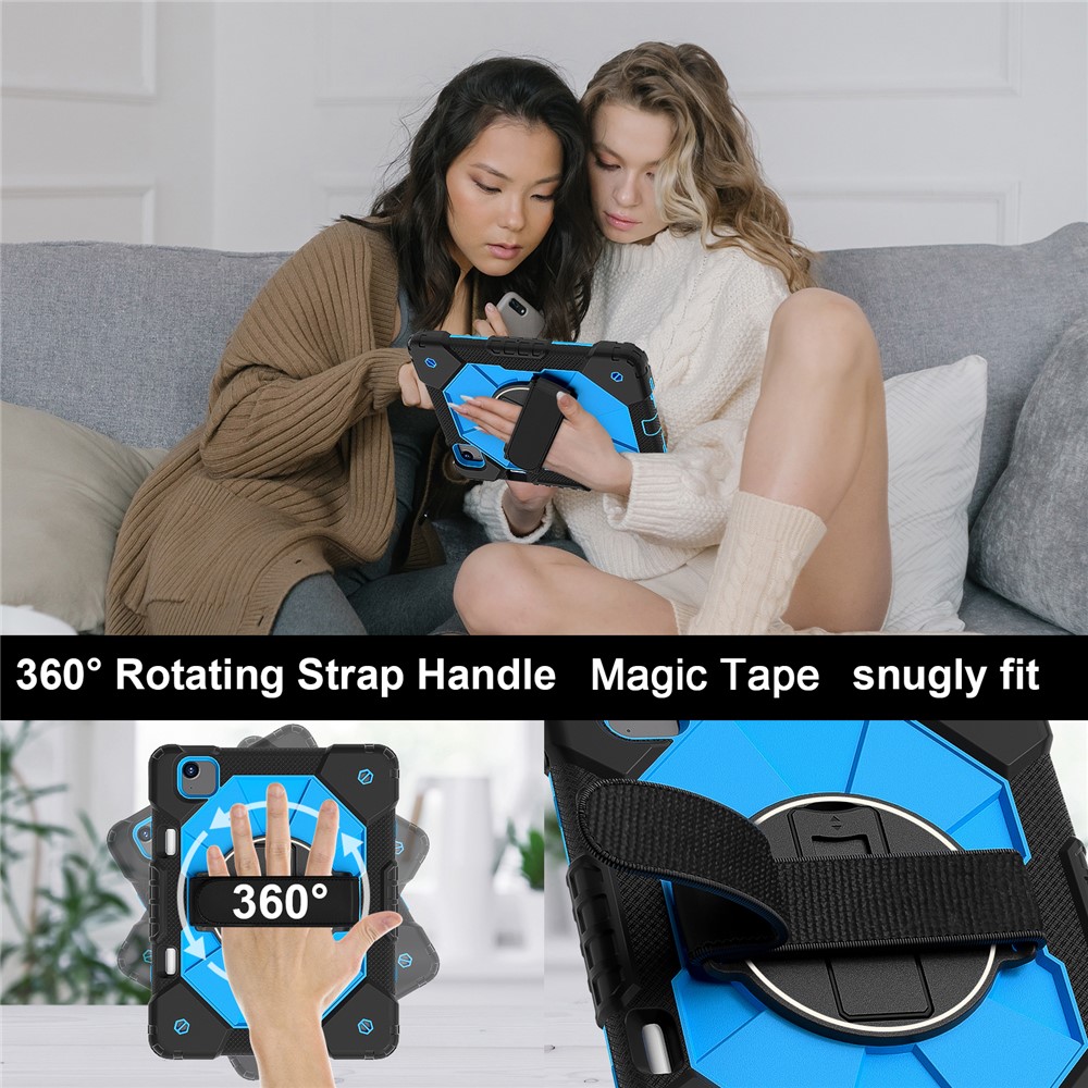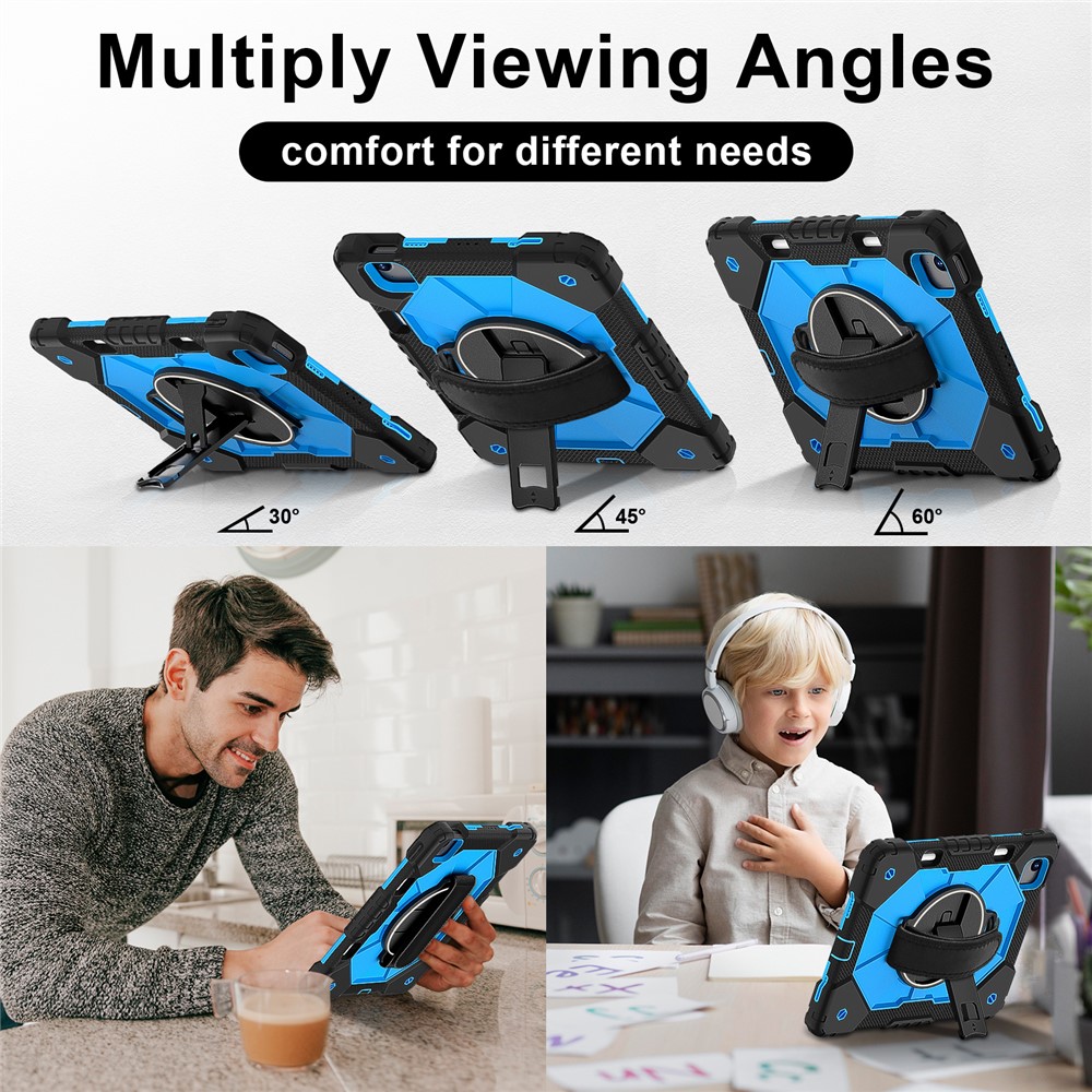 - Folding Kickstand & Hand Strap Features an integrated folding kickstand, allowing hands-free viewing; There is a handy strap on the back of the case, supporting 360-degree rotating, and you can hold your tablet in one hand