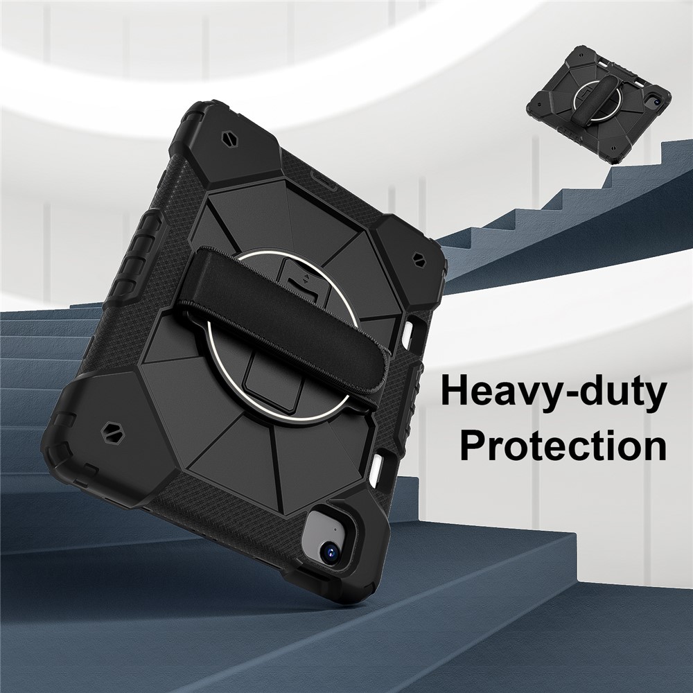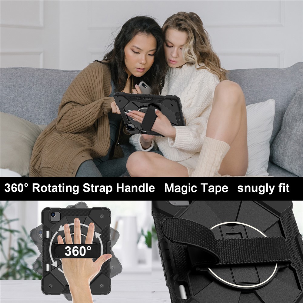 - Folding Kickstand & Hand Strap Features an integrated folding kickstand, allowing hands-free viewing; There is a handy strap on the back of the case, supporting 360-degree rotating, and you can hold your tablet in one hand