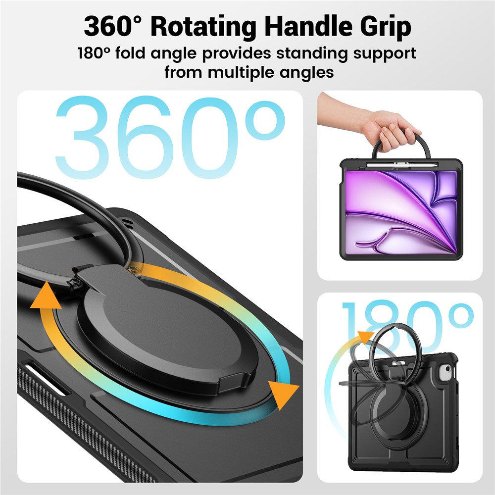 - 360° Rotating Kickstand & Portatble Handle: Features a multifunctional handle that doubles as a 360° rotating kickstand, allowing for easy carrying and convenient hands-free viewing at various angles