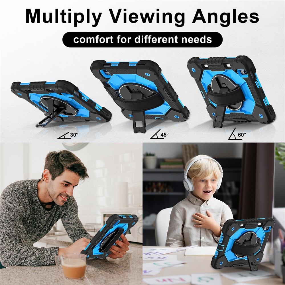 - Folding Kickstand & Hand Strap Features an integrated folding kickstand, allowing hands-free viewing; There is a handy strap on the back of the case, supporting 360-degree rotating, and you can hold your tablet in one hand
