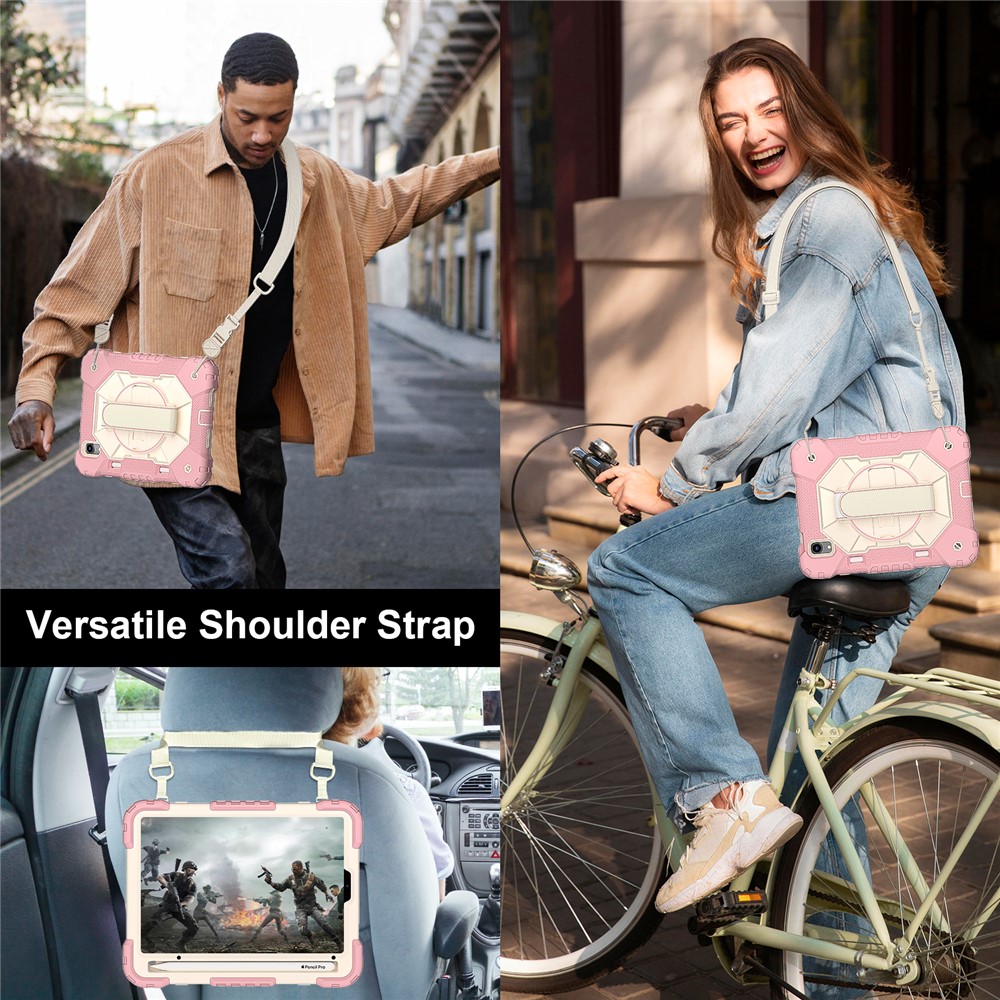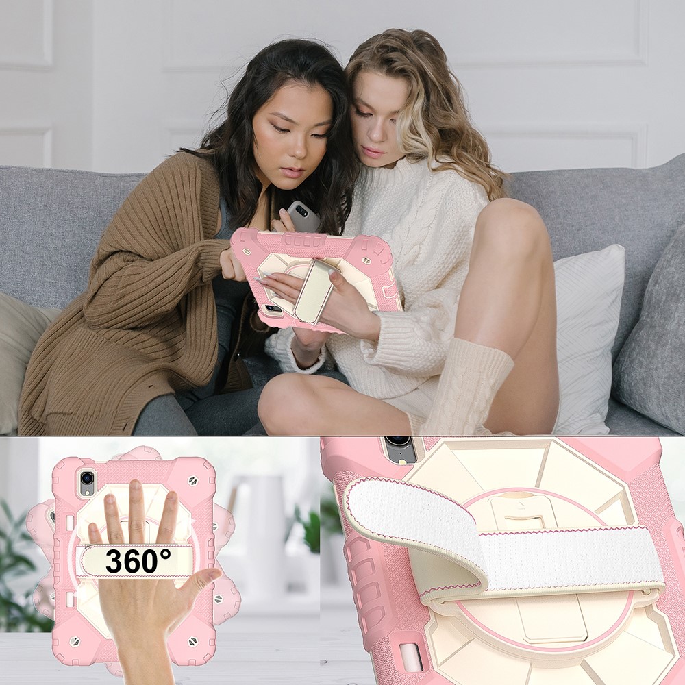 - Folding Kickstand & Hand Strap Features an integrated folding kickstand, allowing hands-free viewing; There is a handy strap on the back of the case, supporting 360-degree rotating, and you can hold your tablet in one hand