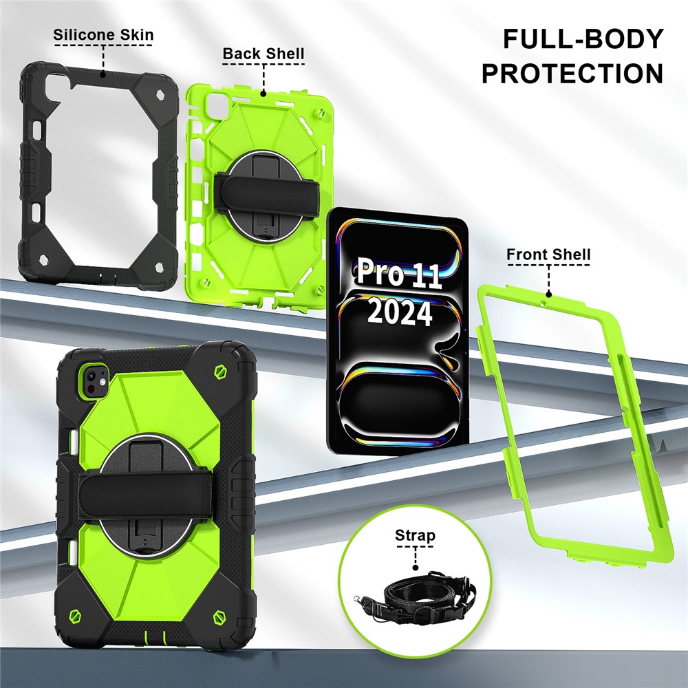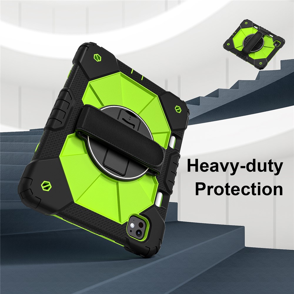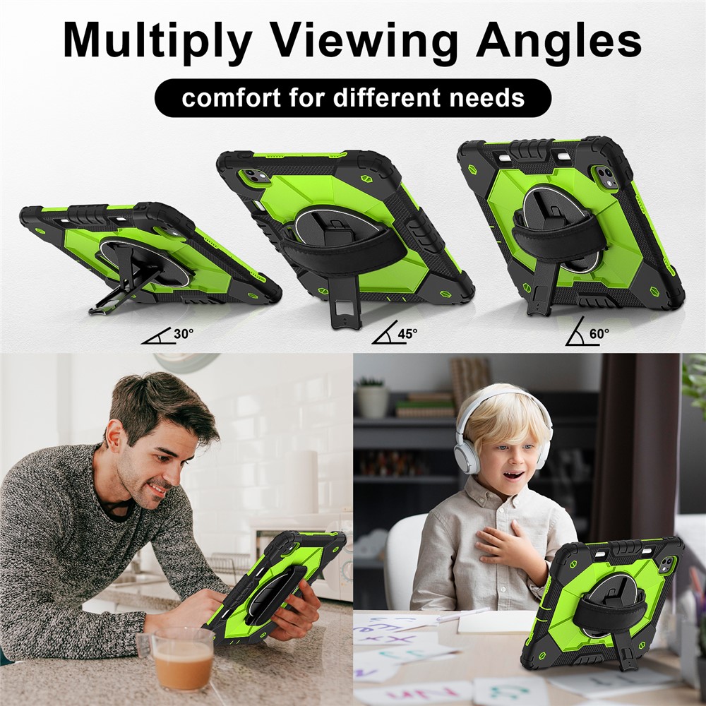 - Folding Kickstand & Hand Strap Features an integrated folding kickstand, allowing hands-free viewing; There is a handy strap on the back of the case, supporting 360-degree rotating, and you can hold your tablet in one hand