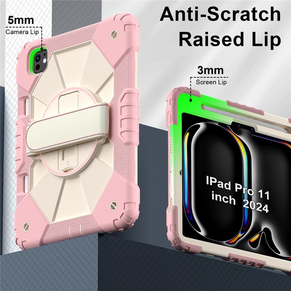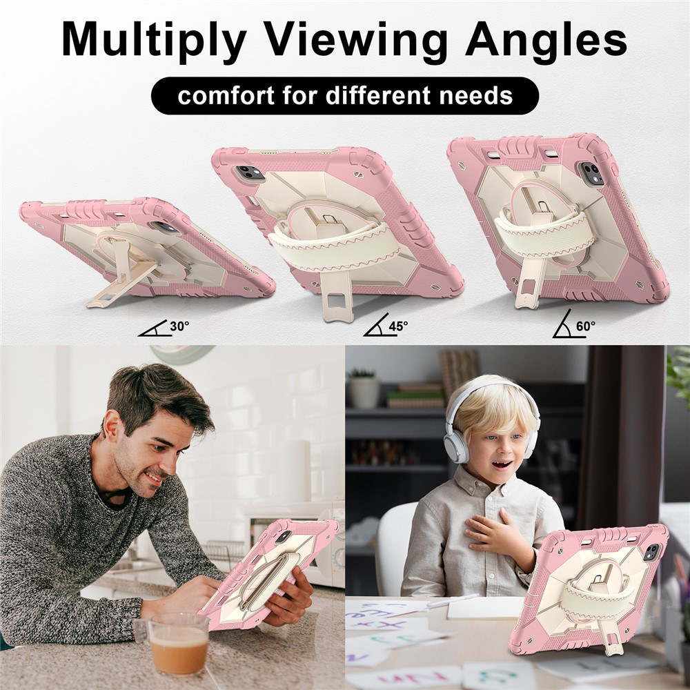 - Folding Kickstand & Hand Strap Features an integrated folding kickstand, allowing hands-free viewing; There is a handy strap on the back of the case, supporting 360-degree rotating, and you can hold your tablet in one hand