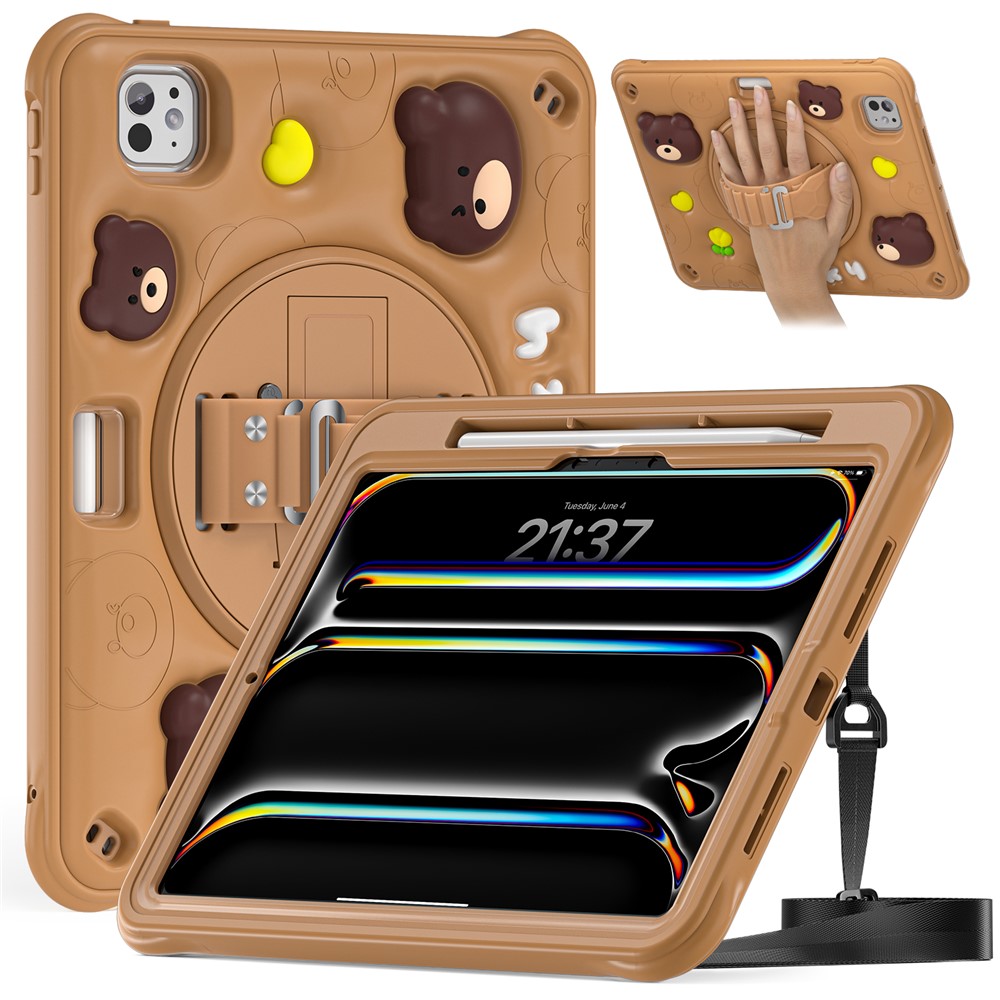 For iPad Pro 11 (2025) / 11 (2024) Case with Shoulder Strap Bear Pattern PC+Silicone+TPU Kickstand Tablet Cover