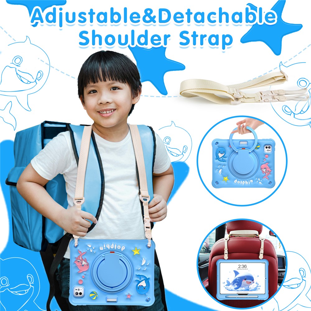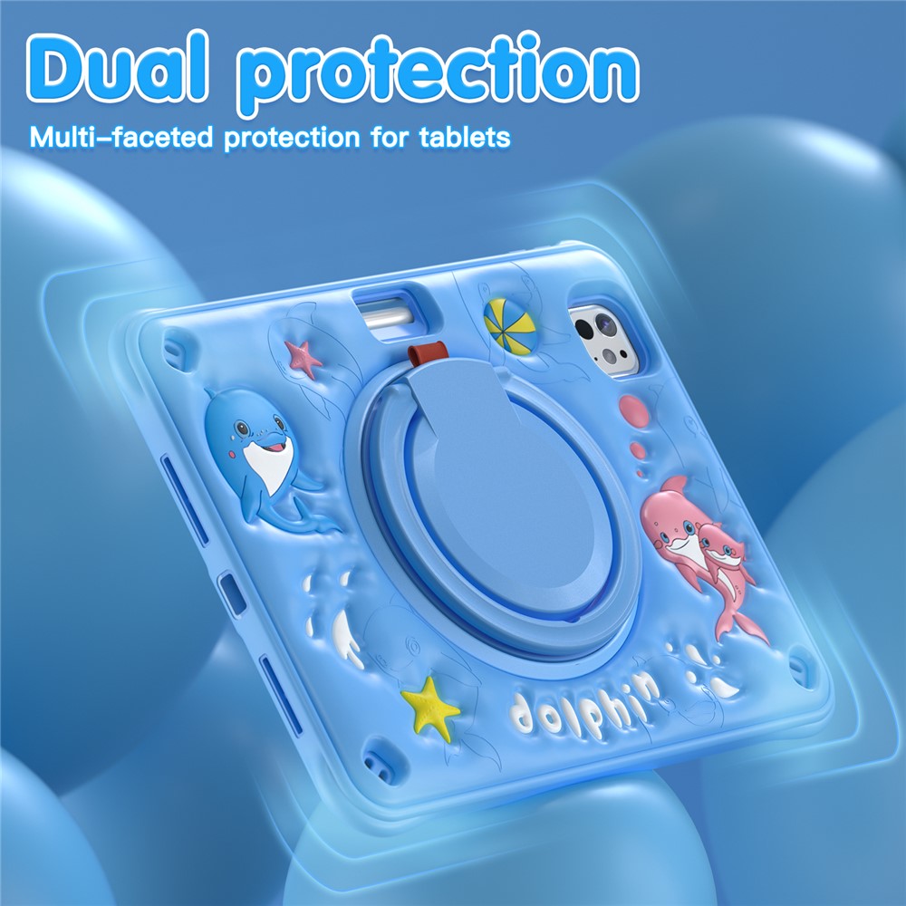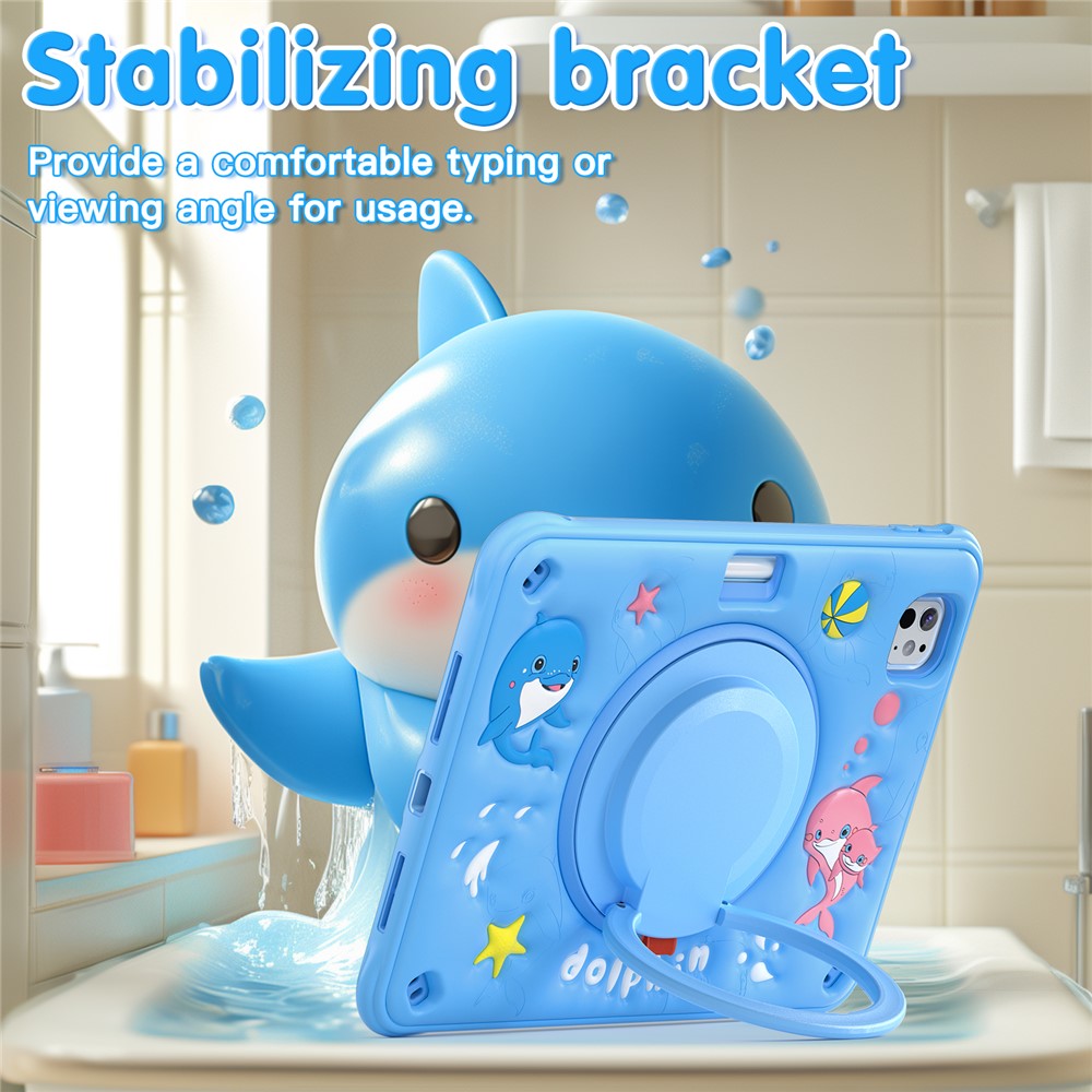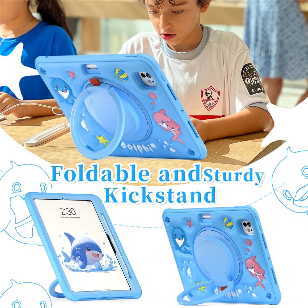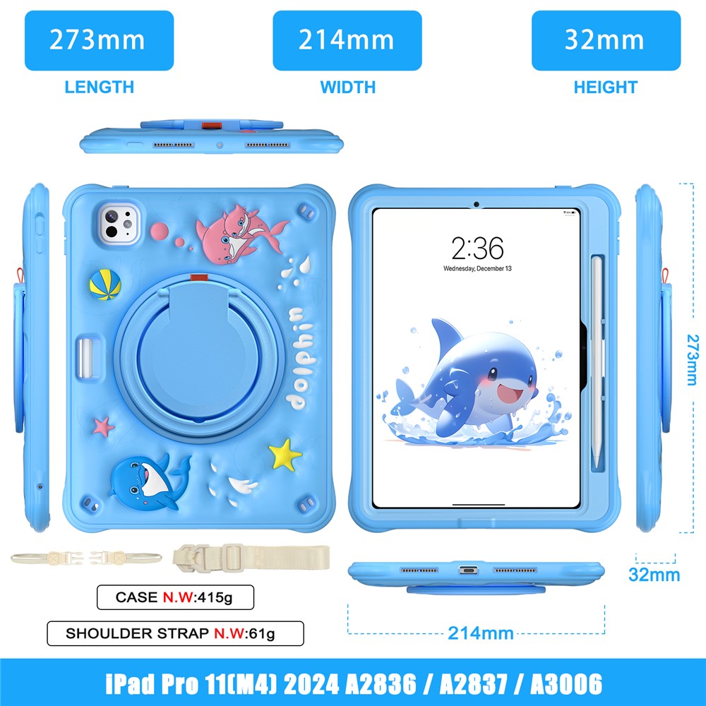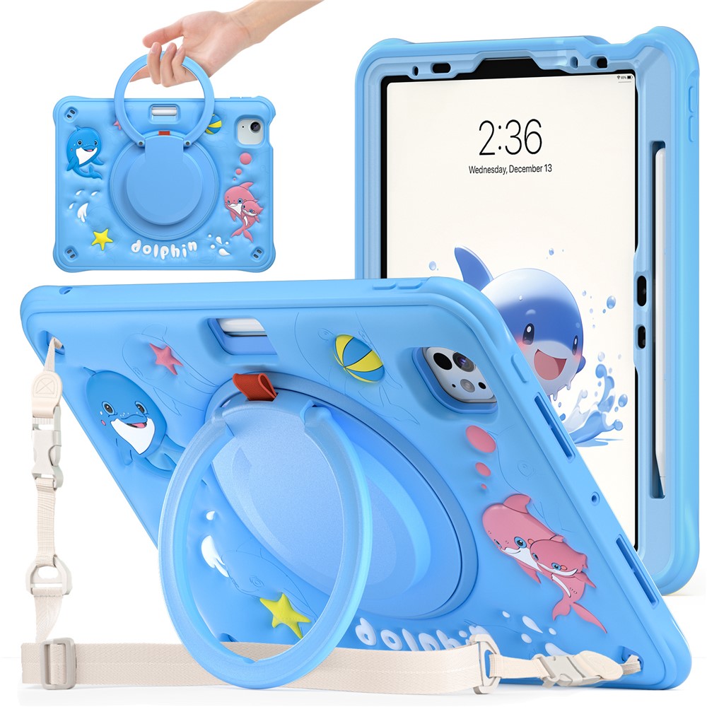 For iPad Pro 11 (2025) / 11 (2024) Case with Shoulder Strap Cute Dolphin PC+Silicone+TPU Kickstand Tablet Cover