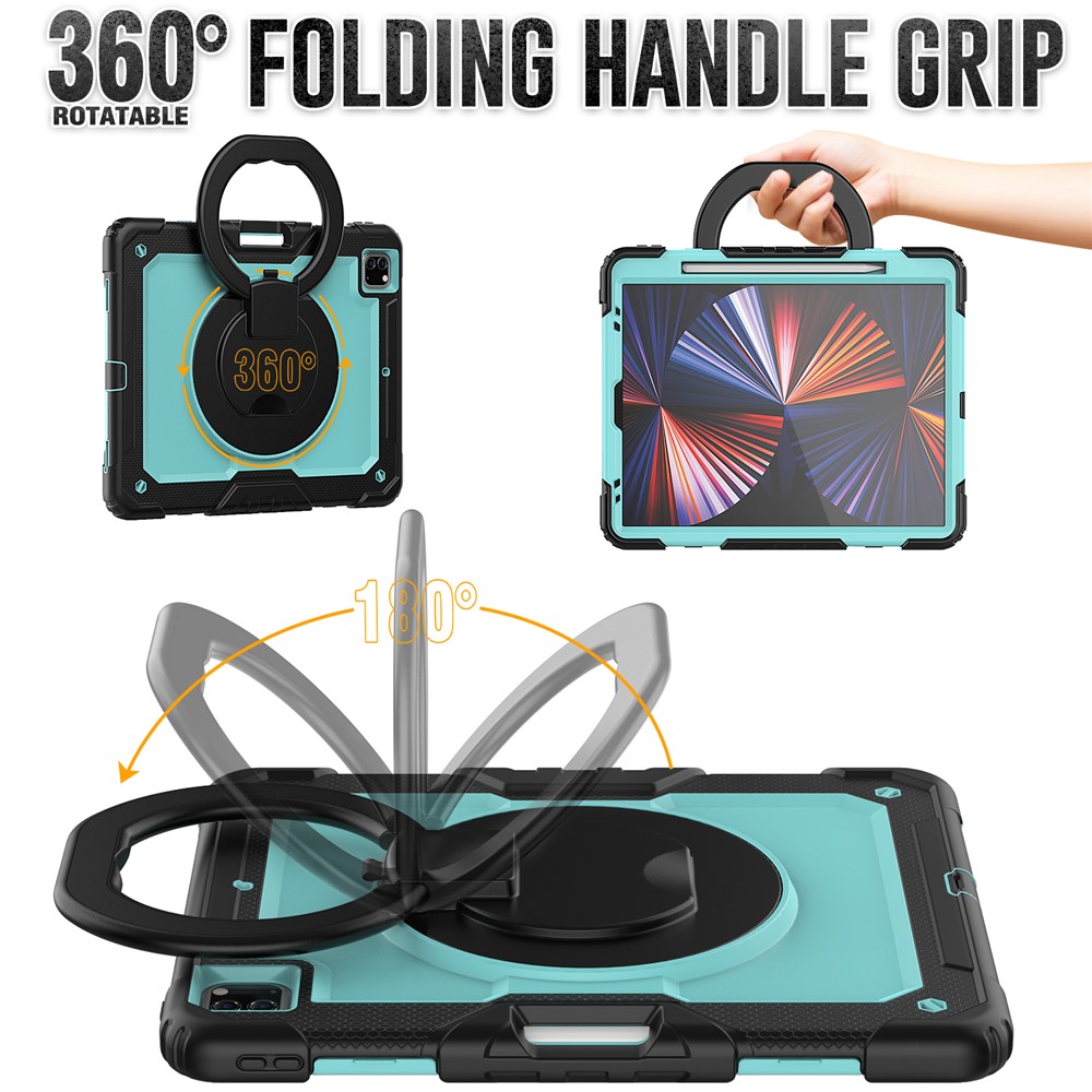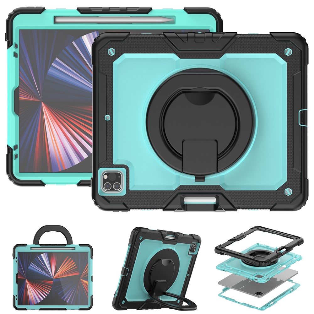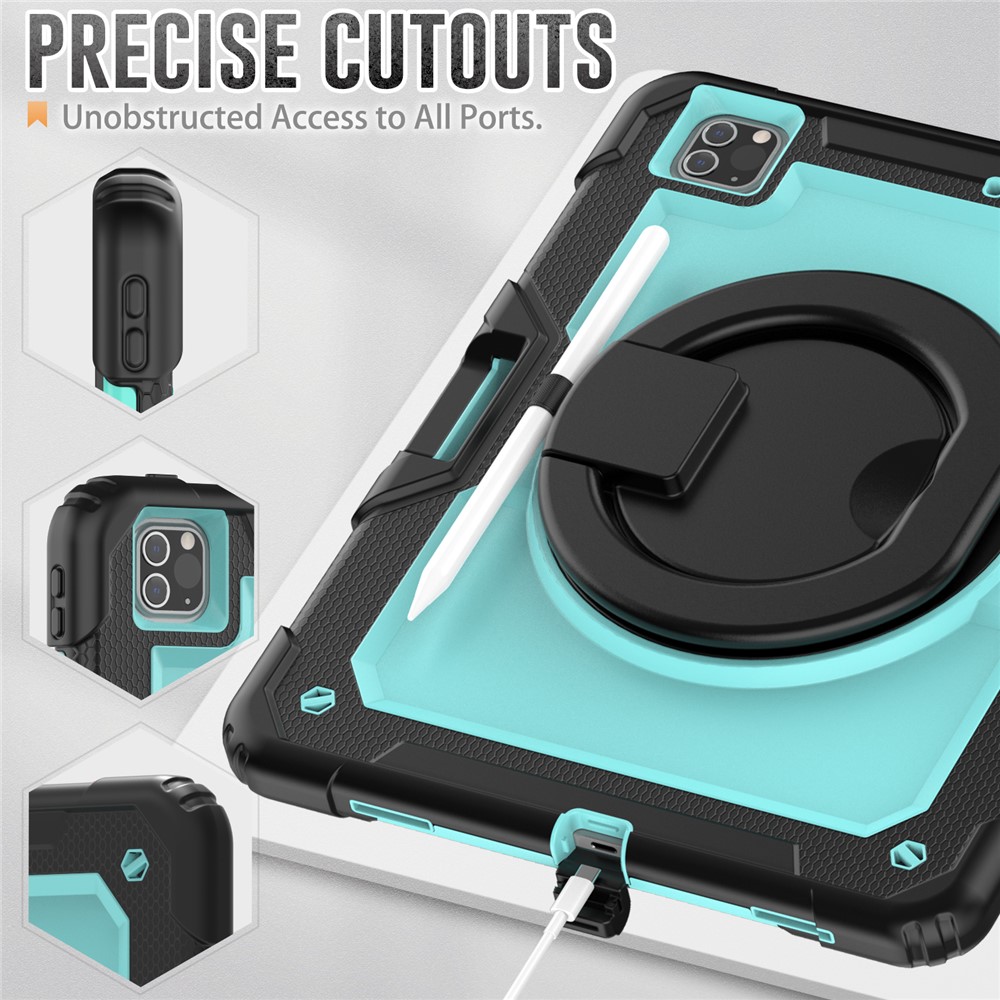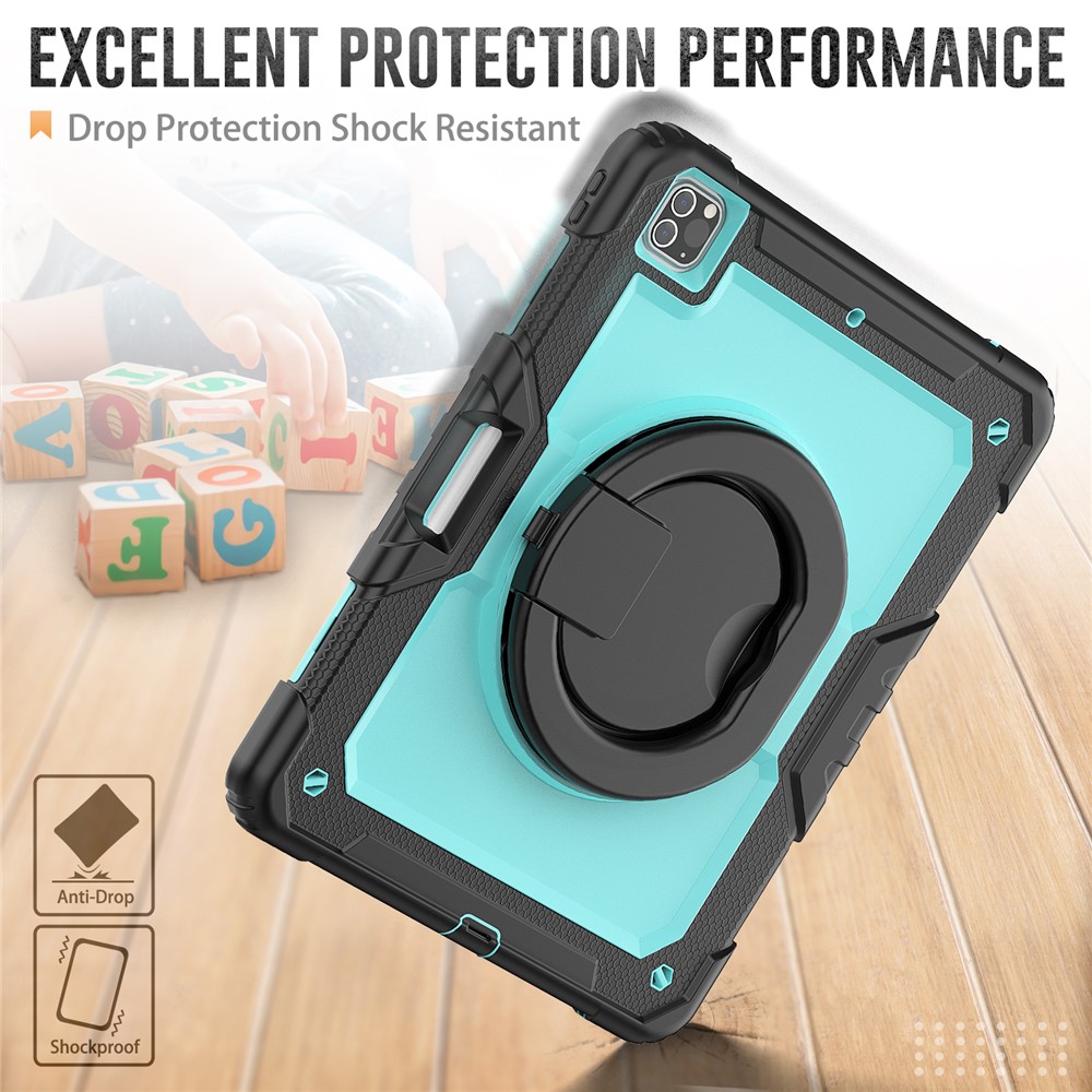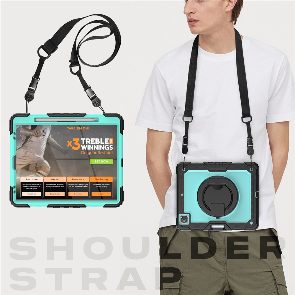 • For iPad Pro 12.9 (2018) / (2020) / (2021) / (2022) 360-Degree Rotating Kickstand Tablet Case Anti-drop PC + Silicone Protective Cover with Shoulder Strap - Black  /  Lime PC
