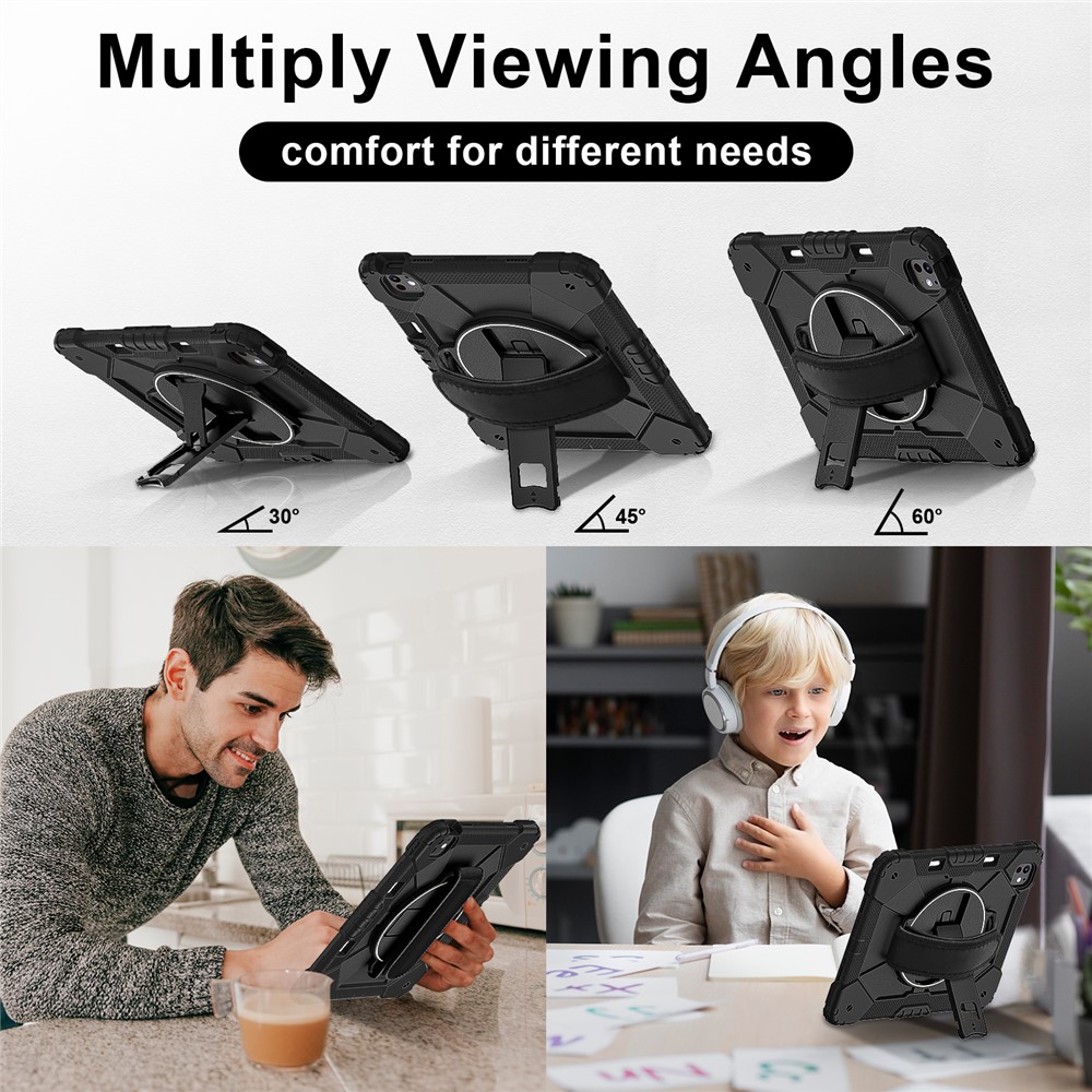 - Folding Kickstand & Hand Strap Features an integrated folding kickstand, allowing hands-free viewing; There is a handy strap on the back of the case, supporting 360-degree rotating, and you can hold your tablet in one hand