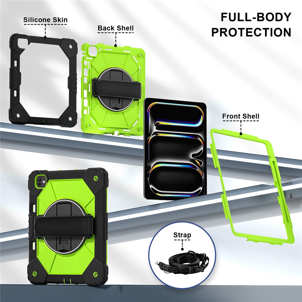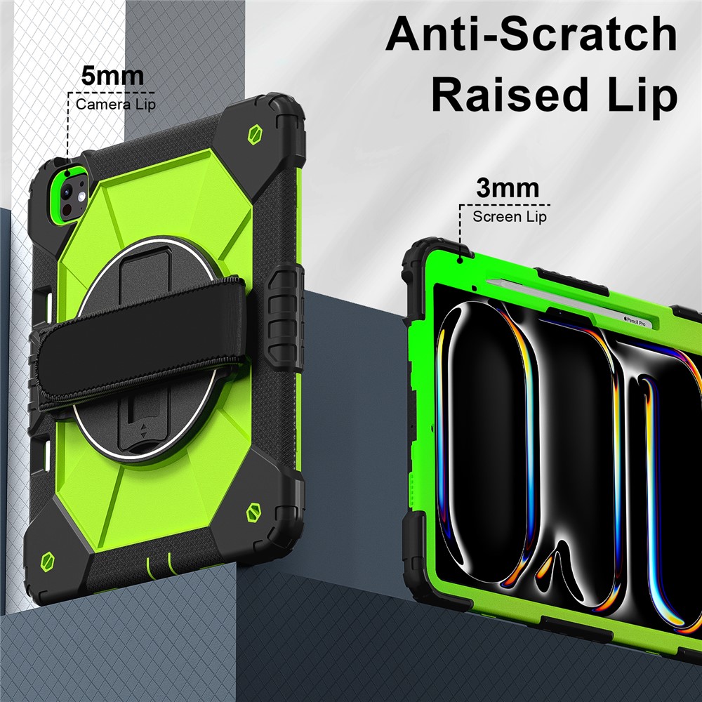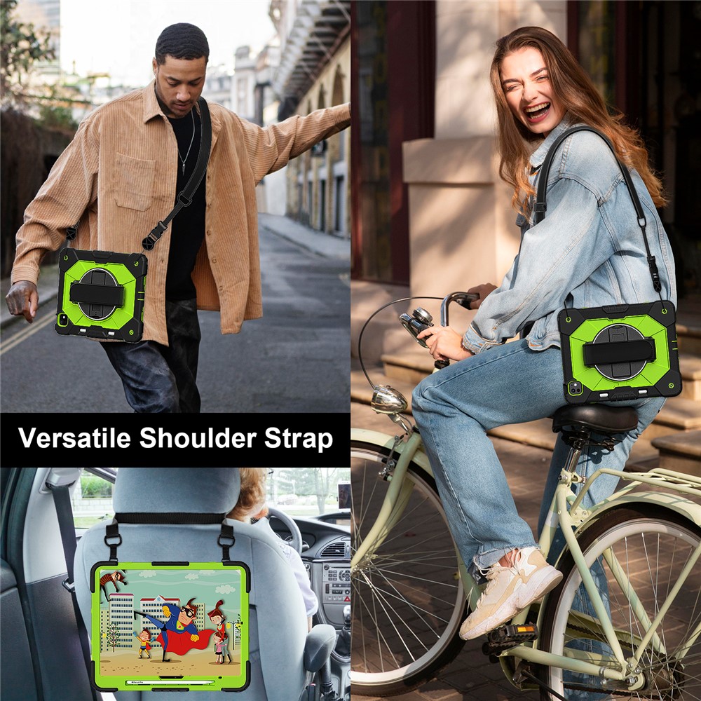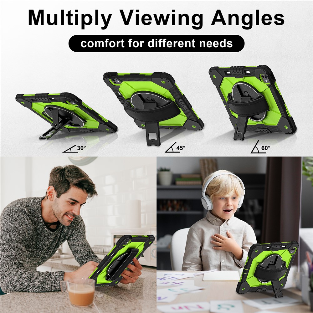 - Folding Kickstand & Hand Strap Features an integrated folding kickstand, allowing hands-free viewing; There is a handy strap on the back of the case, supporting 360-degree rotating, and you can hold your tablet in one hand