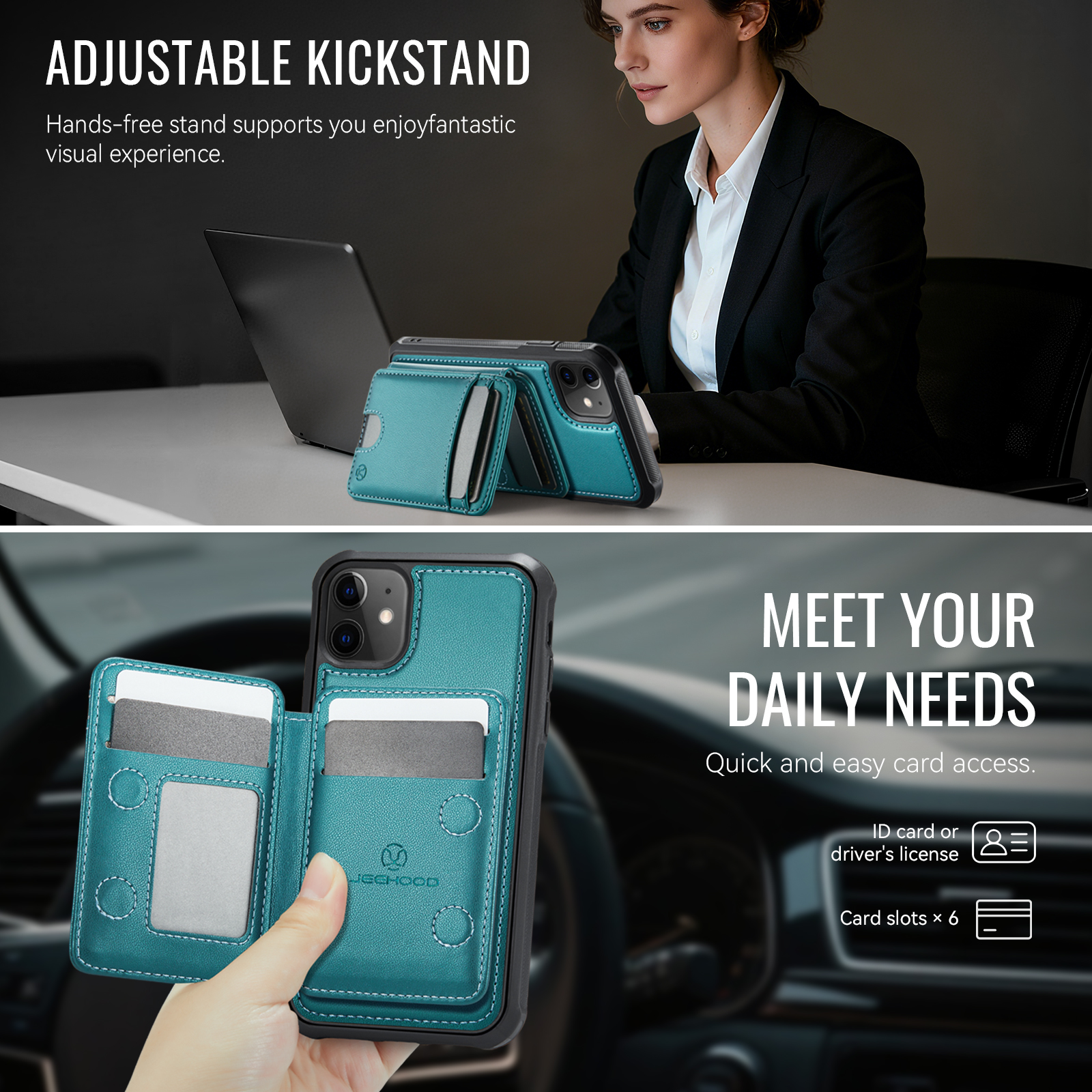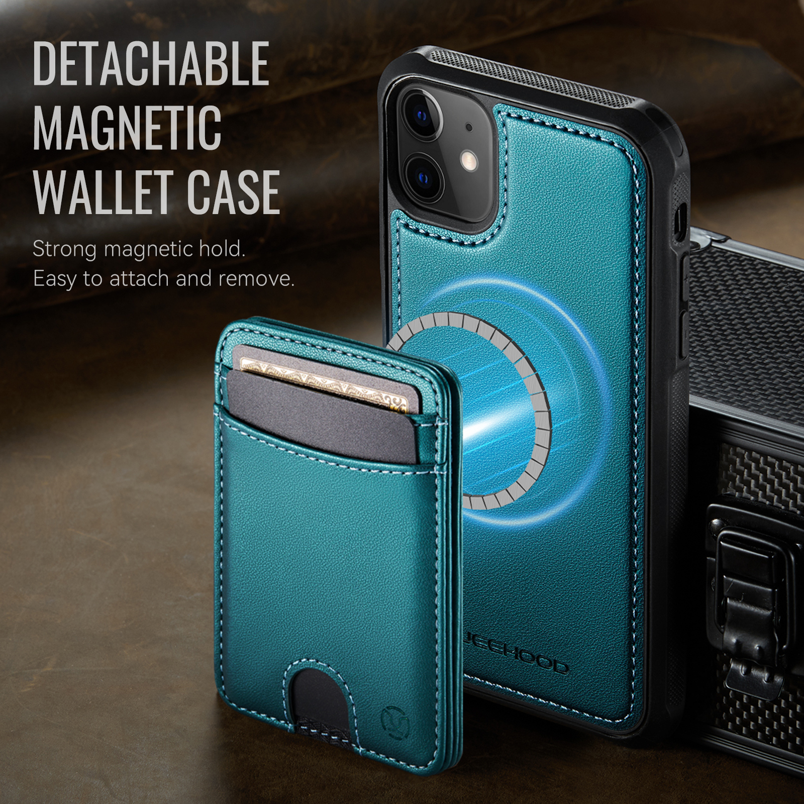 • For iPhone 11 Case JEEHOOD J10  Compatible with MagSafe Leather Back Phone Cover with Detachable Card Holder Kickstand - Black