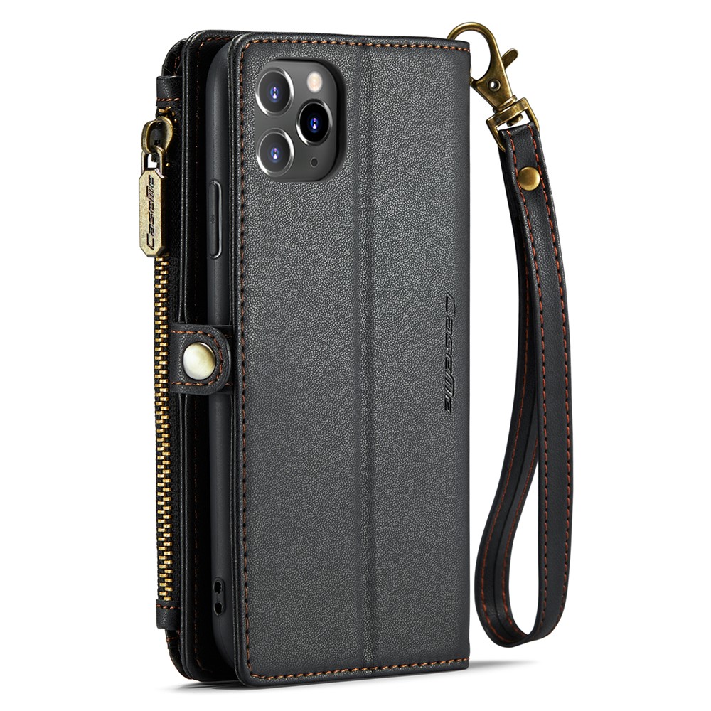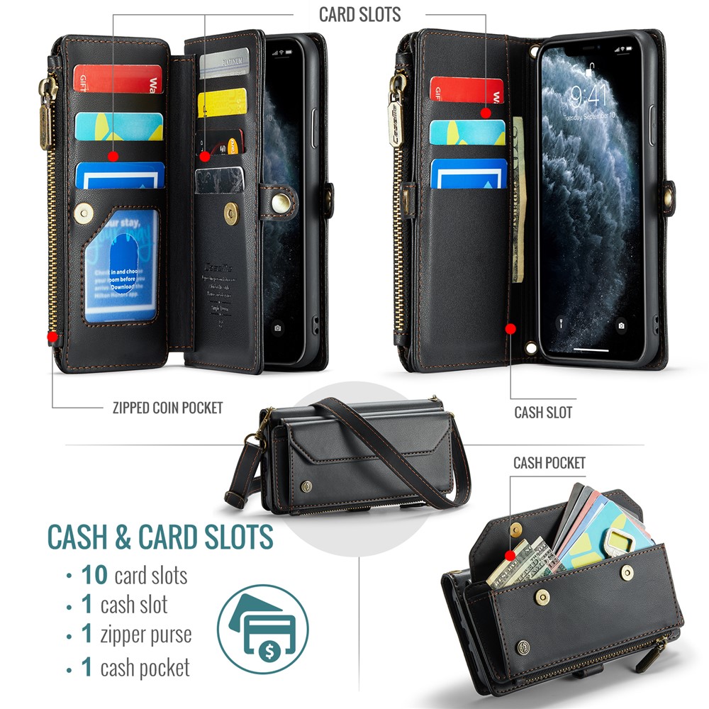 For iPhone 11 Pro Max Leather Case CASEME C36 Zipper Multiple Card Slots Phone Cover with Straps – Black