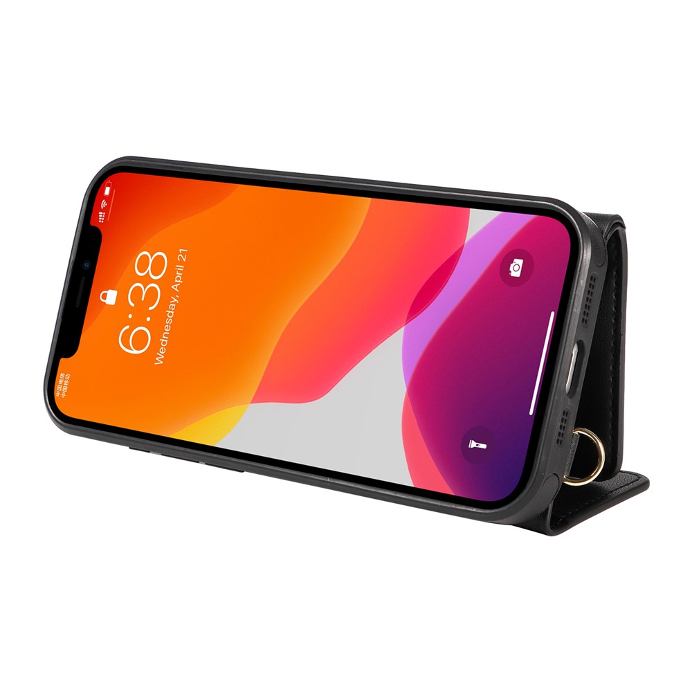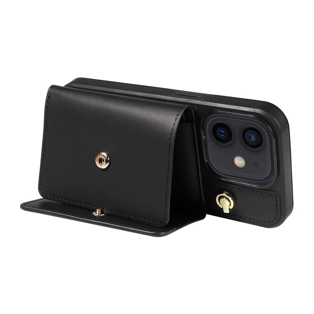 For iPhone 12 Pro / 12 Crossbody Phone Case Card Holder Kickstand Leather Coated TPU Mobile Cover – Black
