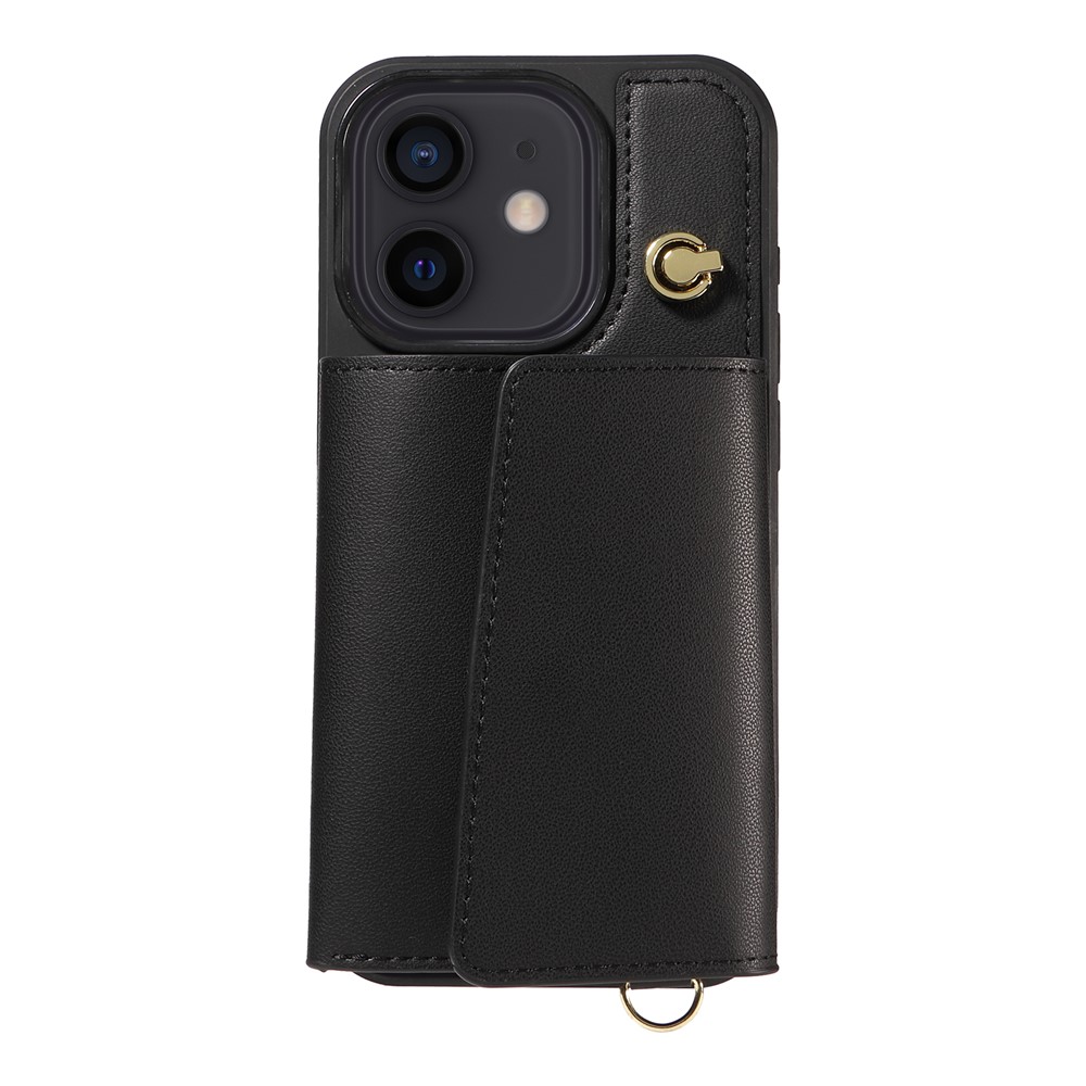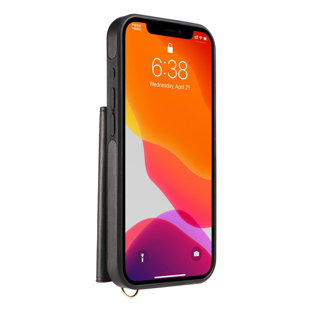 For iPhone 12 Pro / 12 Crossbody Phone Case Card Holder Kickstand Leather Coated TPU Mobile Cover - Black