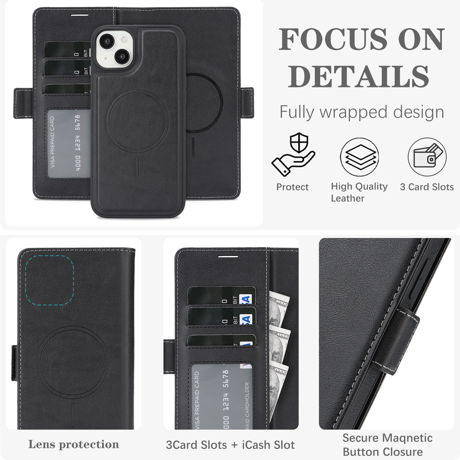For iPhone 13 Case Detachable 2 in 1 Leather Wallet Phone Cover Compatible with MagSafe – Black