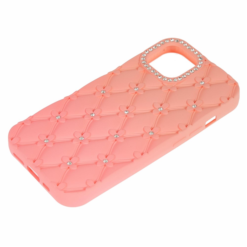 For iPhone 13 Case Rhinestone Decor Rubberized TPU Phone Cover - Pink + Rose
