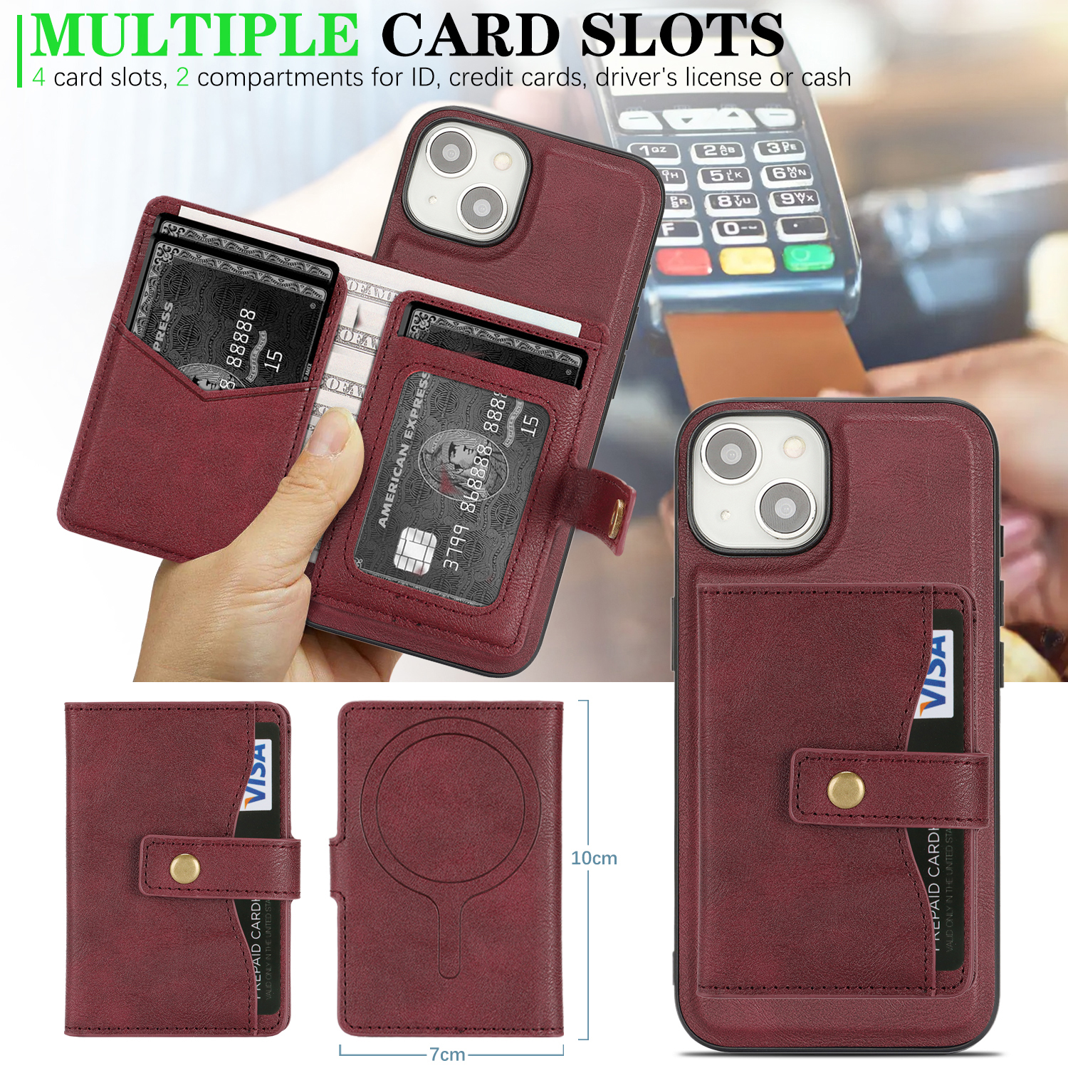 • Versatile Card Storage Multiple card slots accommodate IDs, credit cards, driver’s licenses, or cash, providing convenient all-in-one storage.