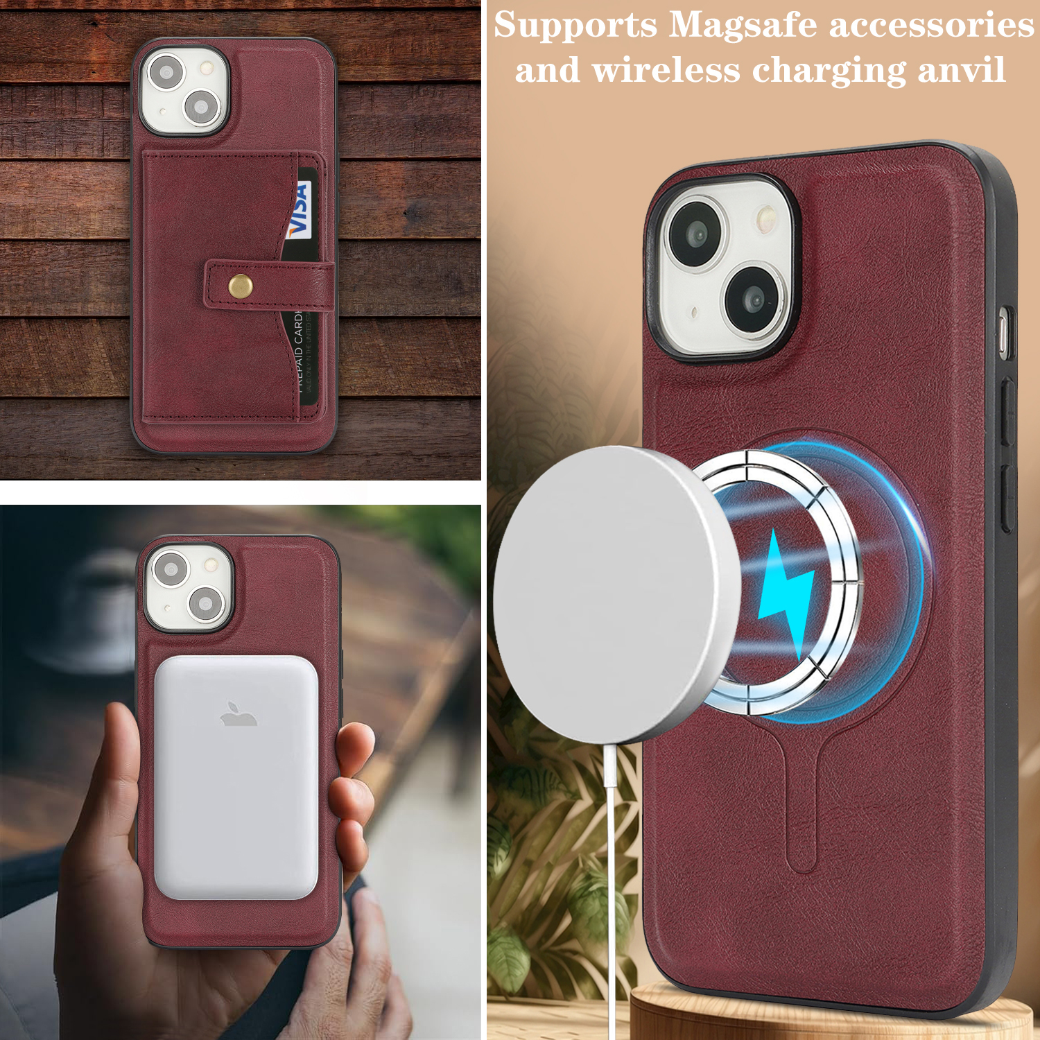 For iPhone 13 Kickstand Case Detachable Card Bag Compatible with MagSafe PU Leather Coated TPU Phone Cover – Red