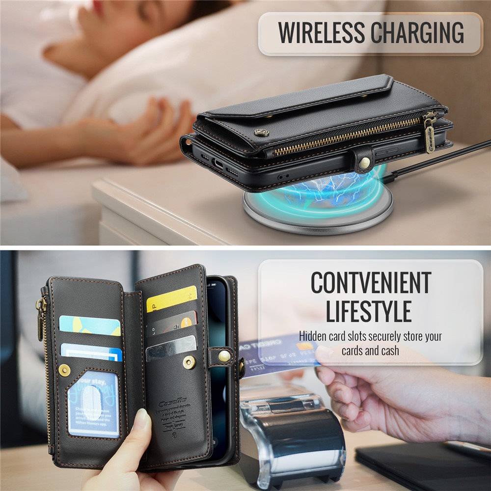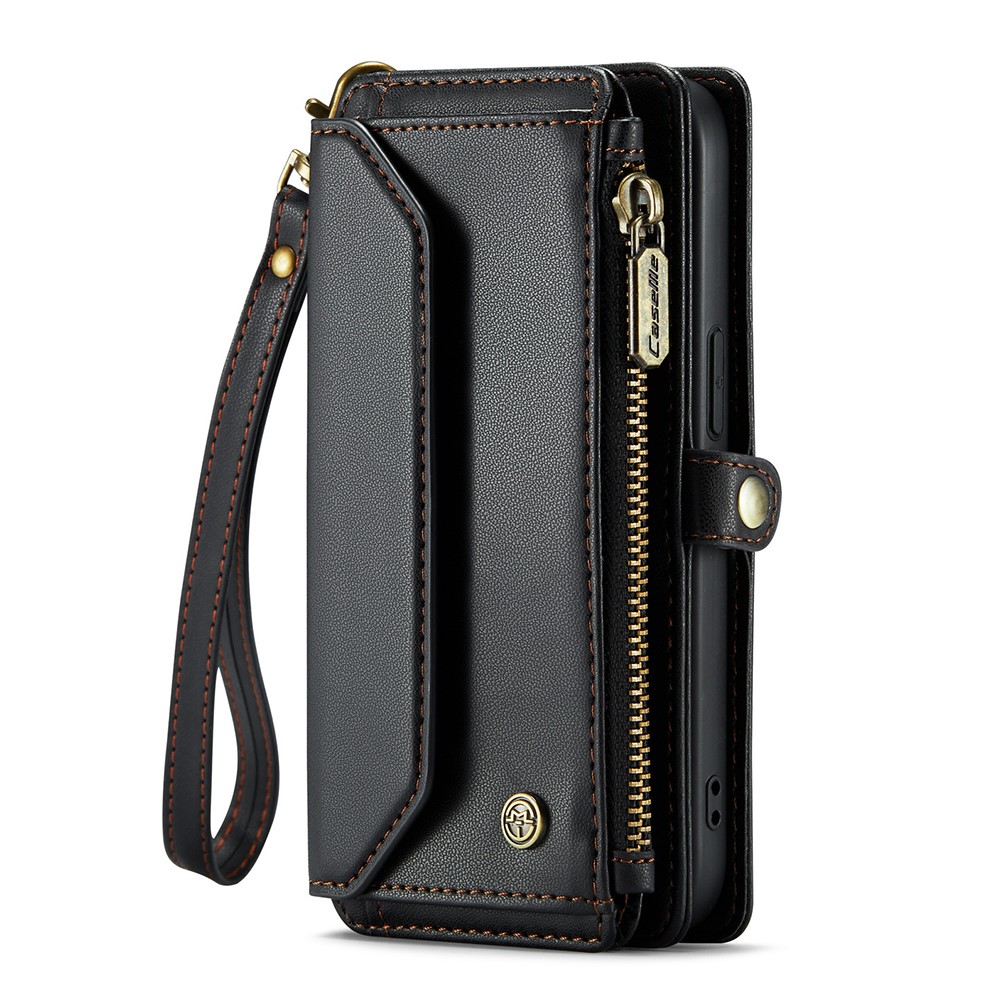 For iPhone 13 mini Leather Case CASEME C36 Zipper Multiple Card Slots Phone Cover with Straps – Black