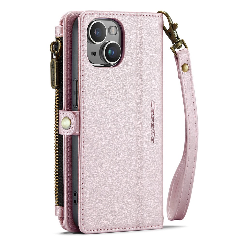 For iPhone 13 mini Leather Case CASEME C36 Zipper Multiple Card Slots Phone Cover with Straps – Pink