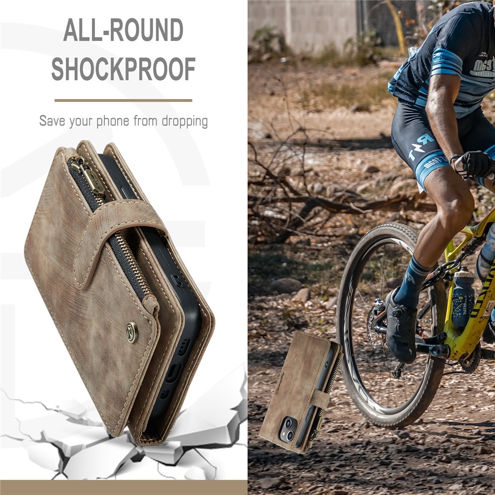 For iPhone 13 mini Phone Cases with Strap CASEME C30 Zipper Multiple Card Holder PU Leather Cover - Brown $21.50