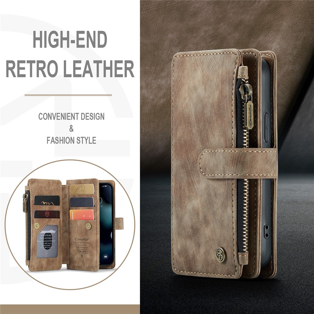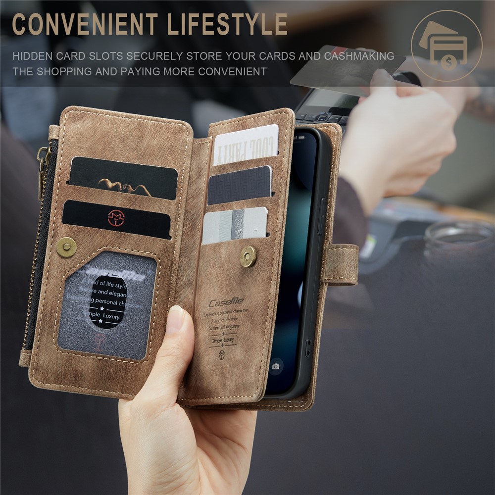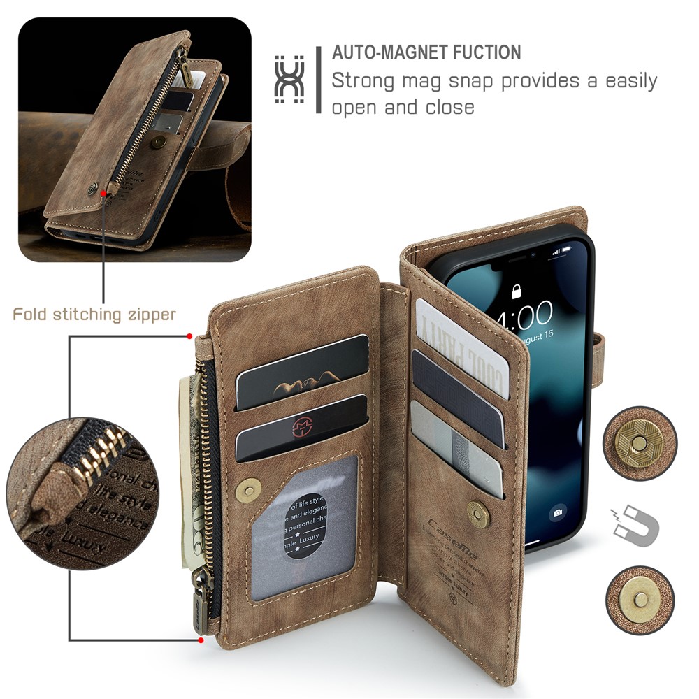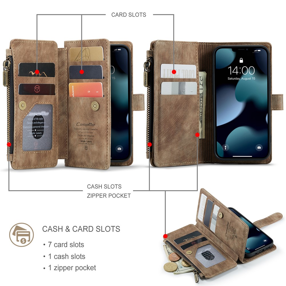 For iPhone 13 mini Phone Cases with Strap CASEME C30 Zipper Multiple Card Holder PU Leather Cover – Brown