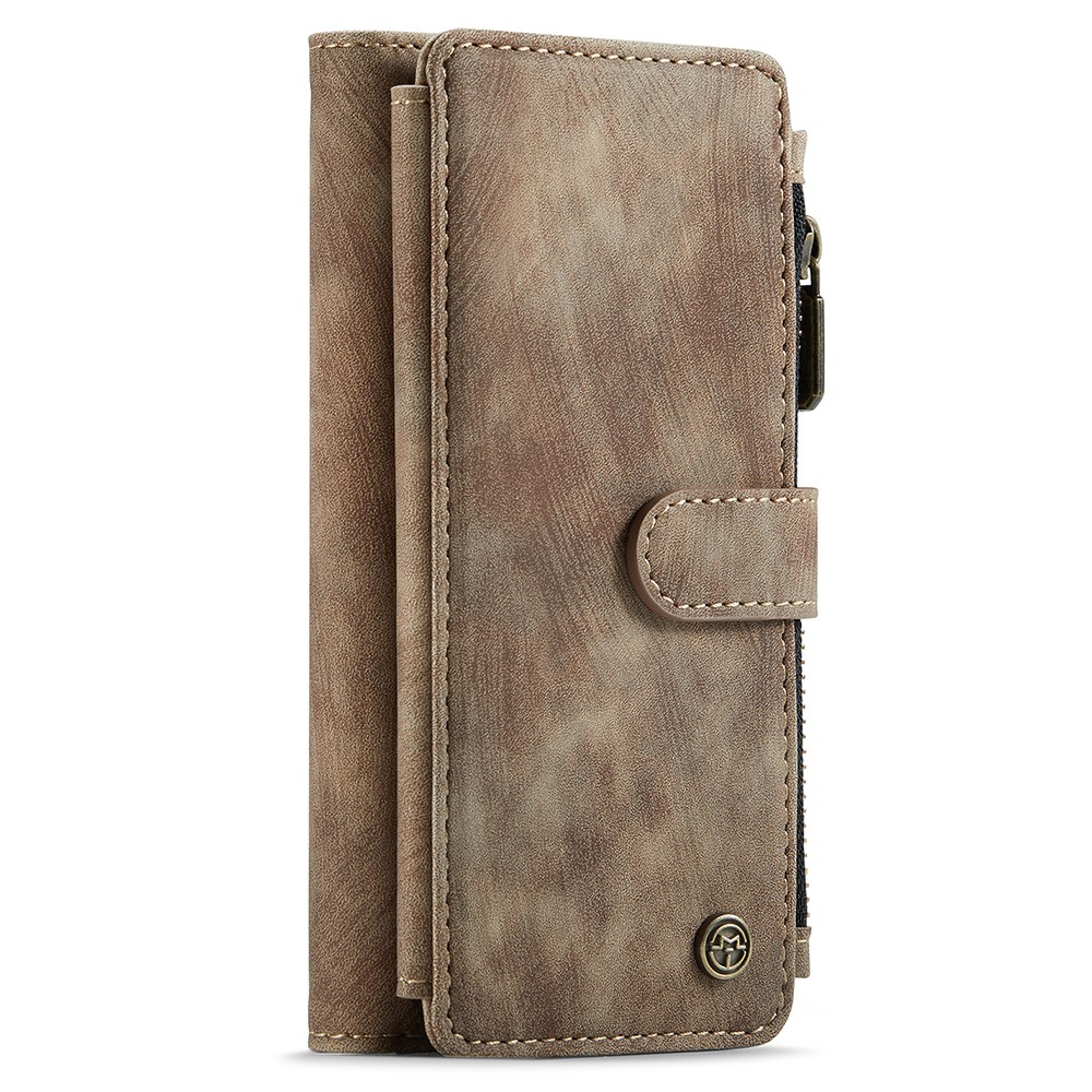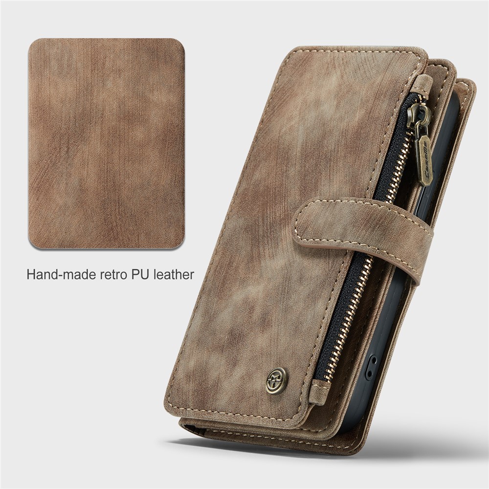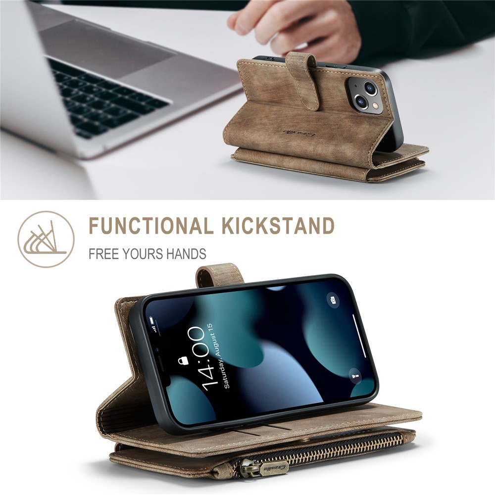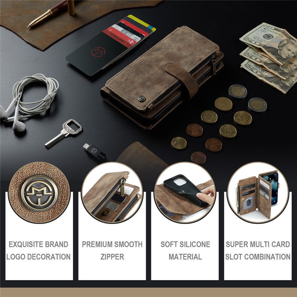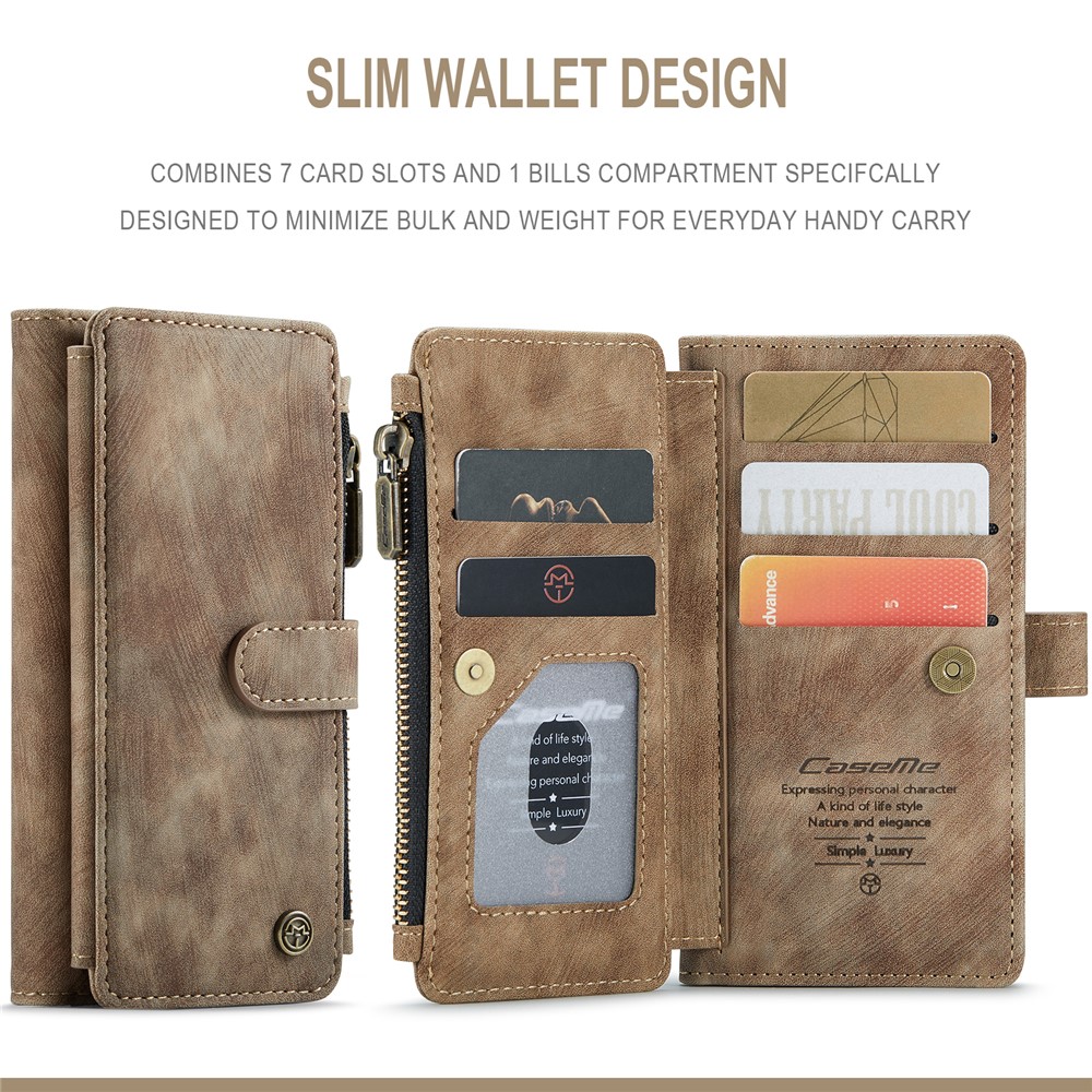 For iPhone 13 mini Phone Cases with Strap CASEME C30 Zipper Multiple Card Holder PU Leather Cover – Brown