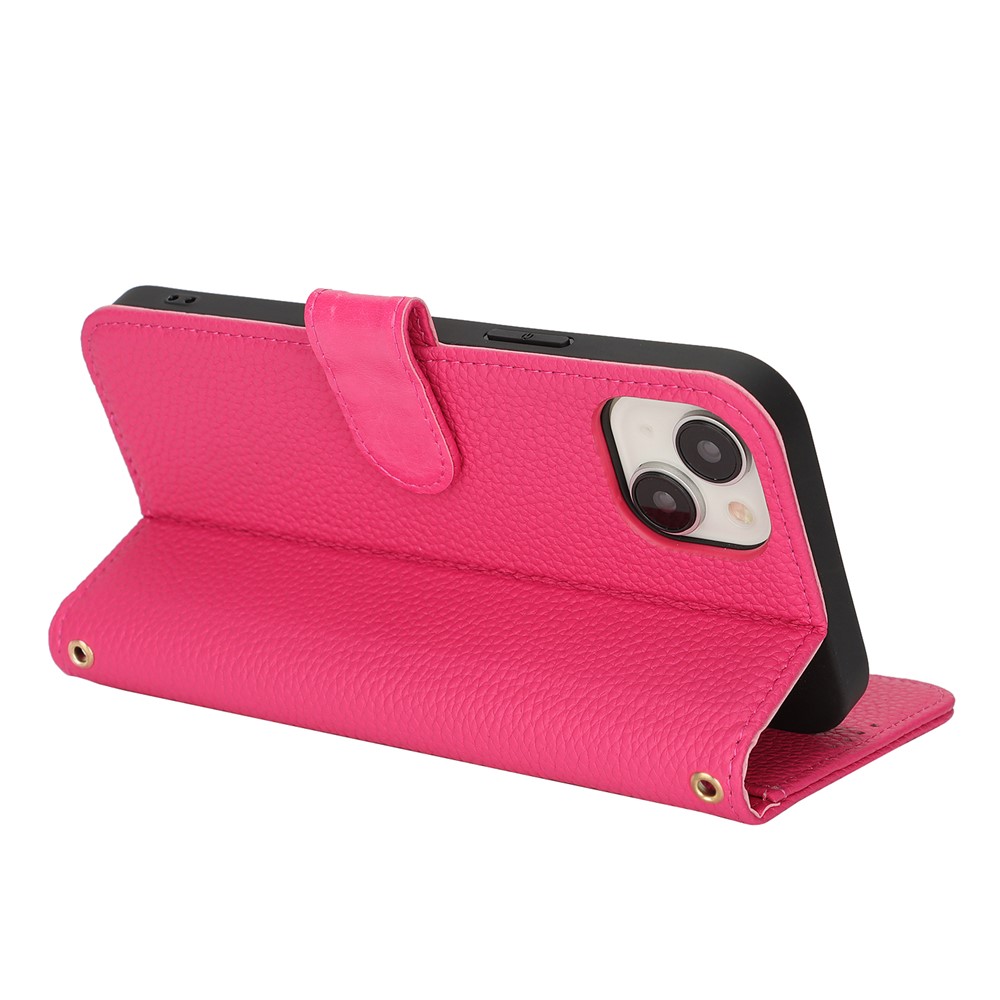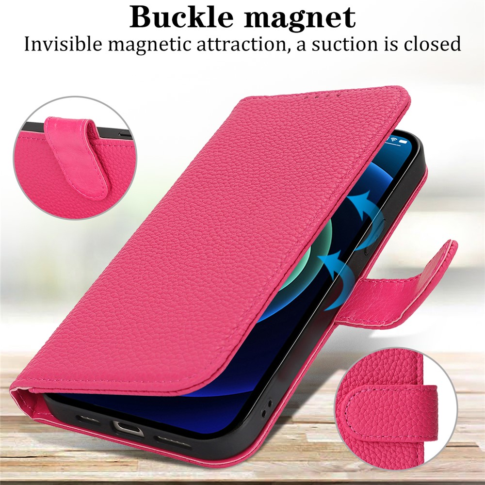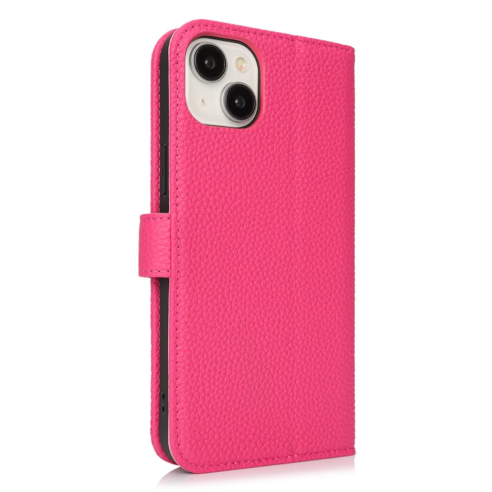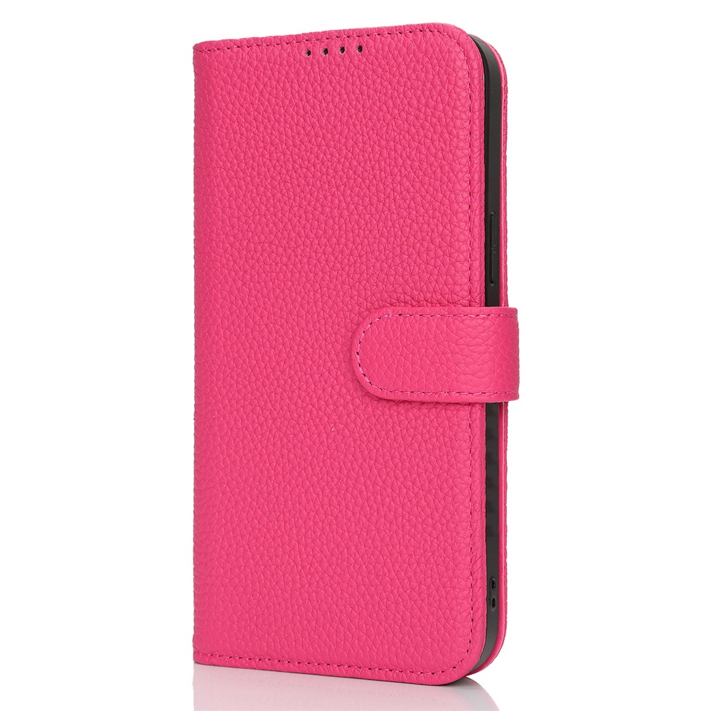 For iPhone 13 mini Stand Case Litchi Texture Genuine Cow Leather Wallet Phone Cover RFID Blocking – Rose