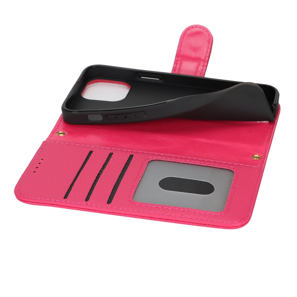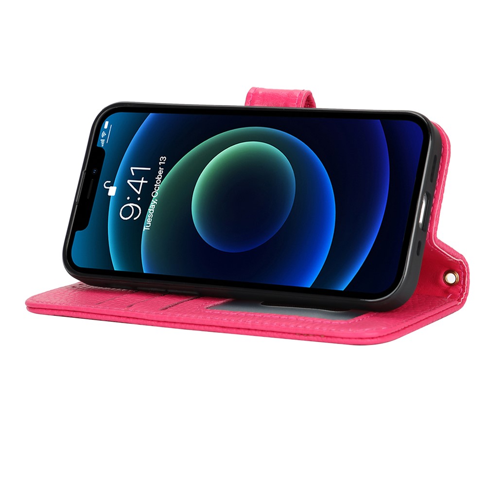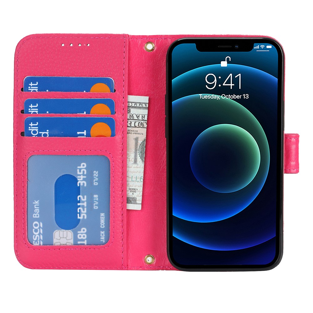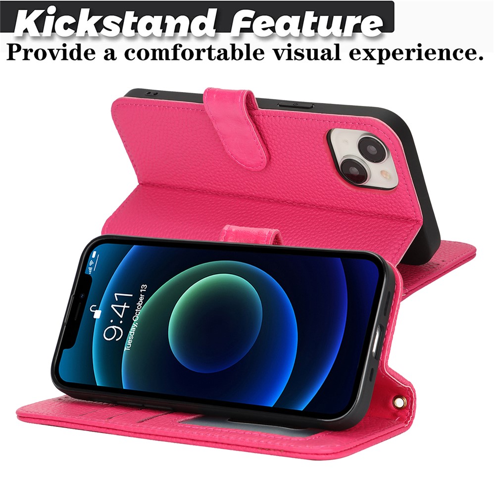 For iPhone 13 mini Stand Case Litchi Texture Genuine Cow Leather Wallet Phone Cover RFID Blocking – Rose