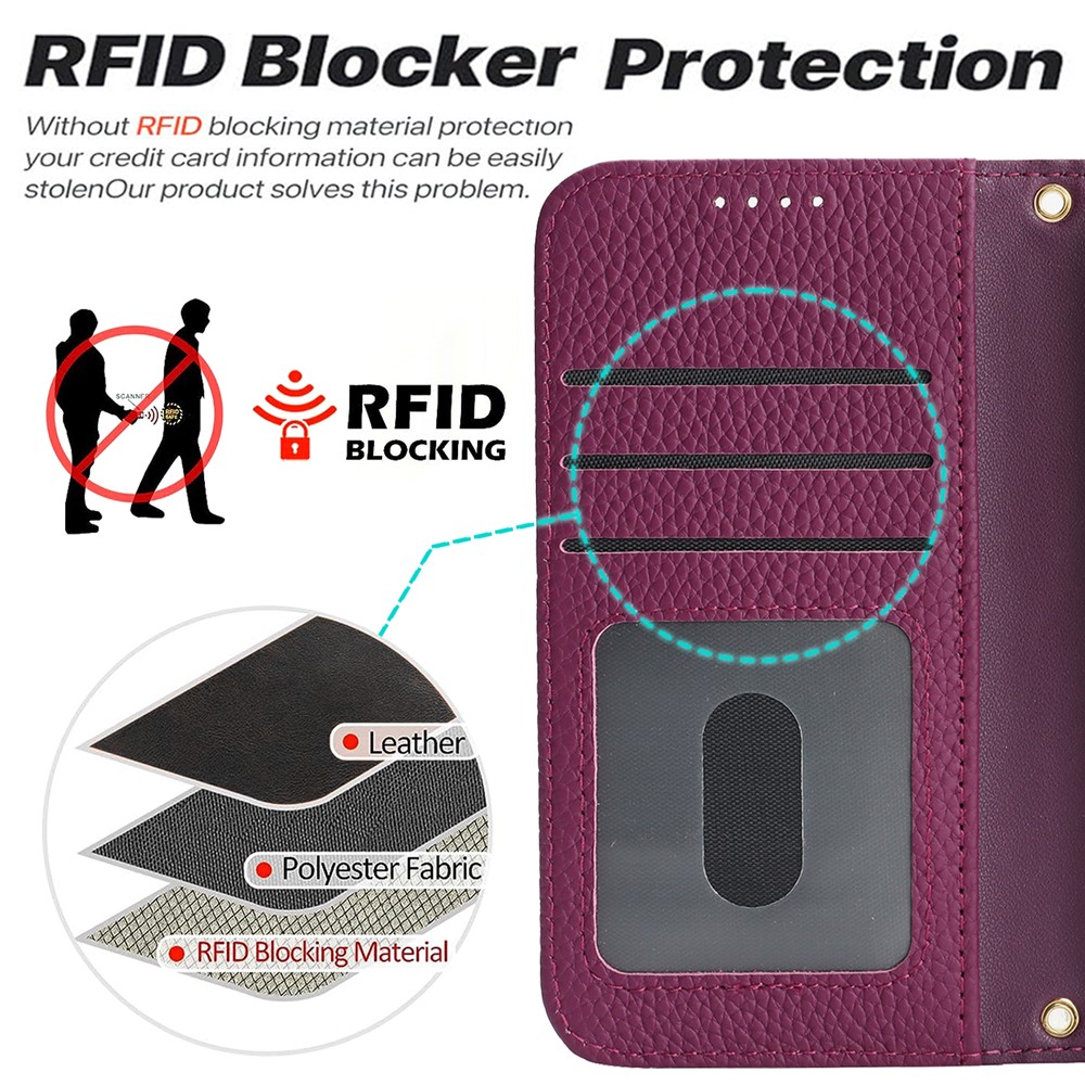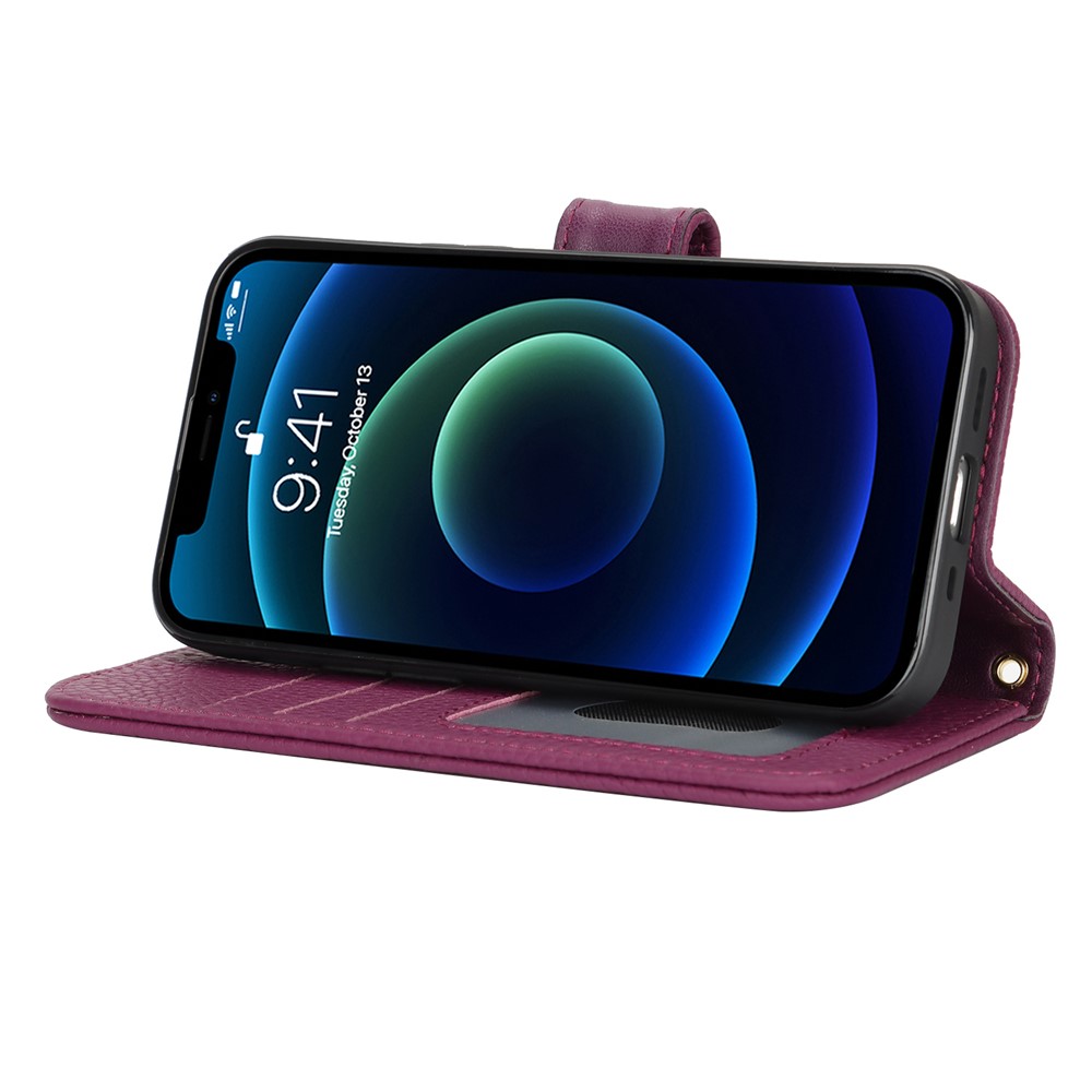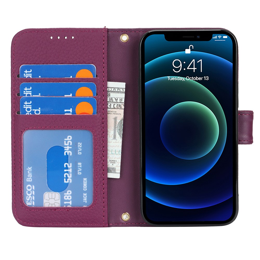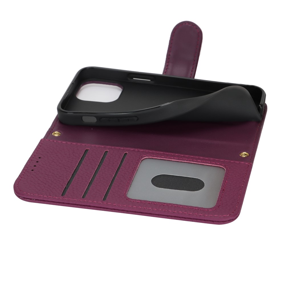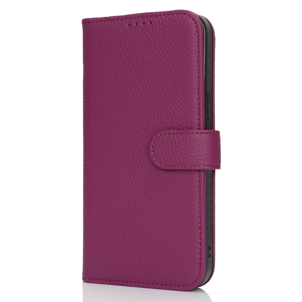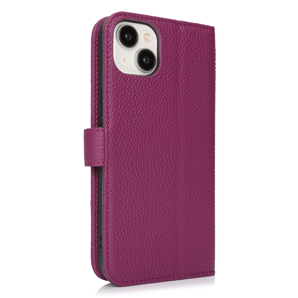 For iPhone 13 mini Stand Case Litchi Texture Genuine Cow Leather Wallet Phone Cover RFID Blocking – Violet