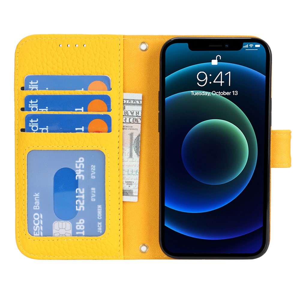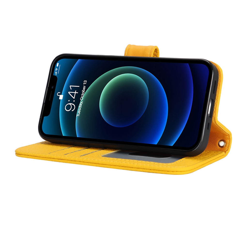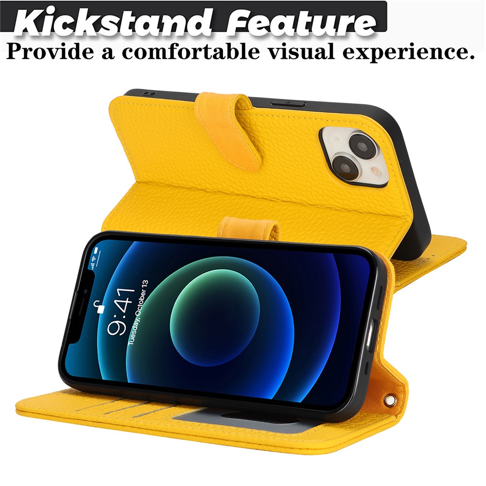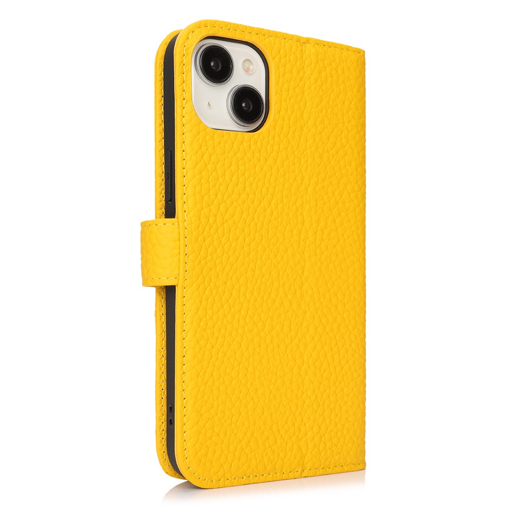 For iPhone 13 mini Stand Case Litchi Texture Genuine Cow Leather Wallet Phone Cover RFID Blocking – Yellow