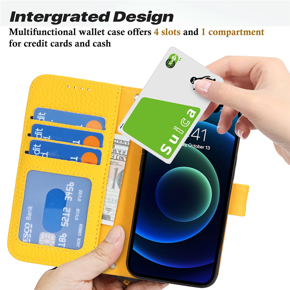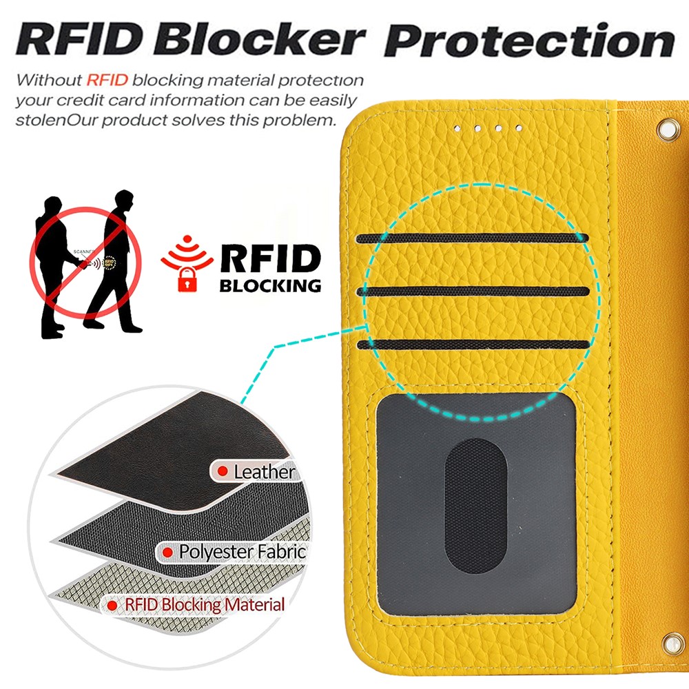 • For iPhone 13 mini Stand Case Litchi Texture Genuine Cow Leather Wallet Phone Cover RFID Blocking - Dark Yellow