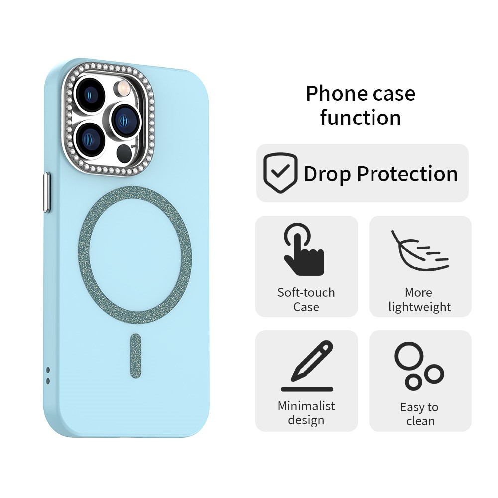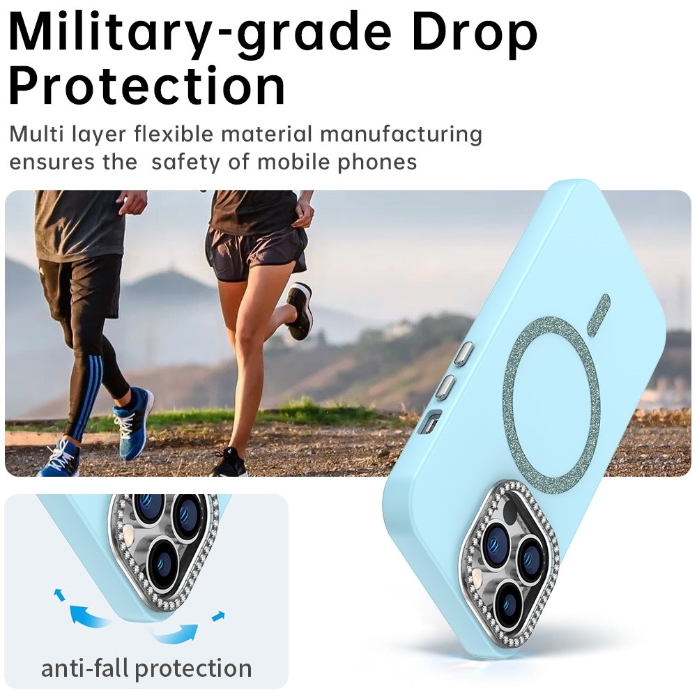 For iPhone 13 Pro Case Compatible with MagSafe TPU + PET Phone Cover with Rhinestone Decor Lens Frame - Blue $13.17