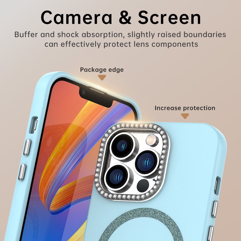 • Rhinestone Lens Frame The lens frame is adorned with sparkling rhinestones, adding a luxurious and eye-catching touch to your phone while protecting the camera