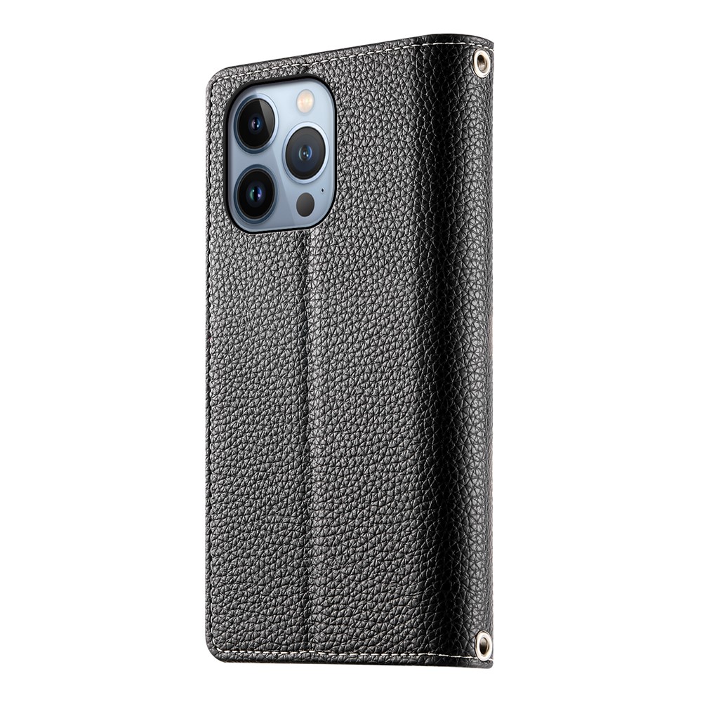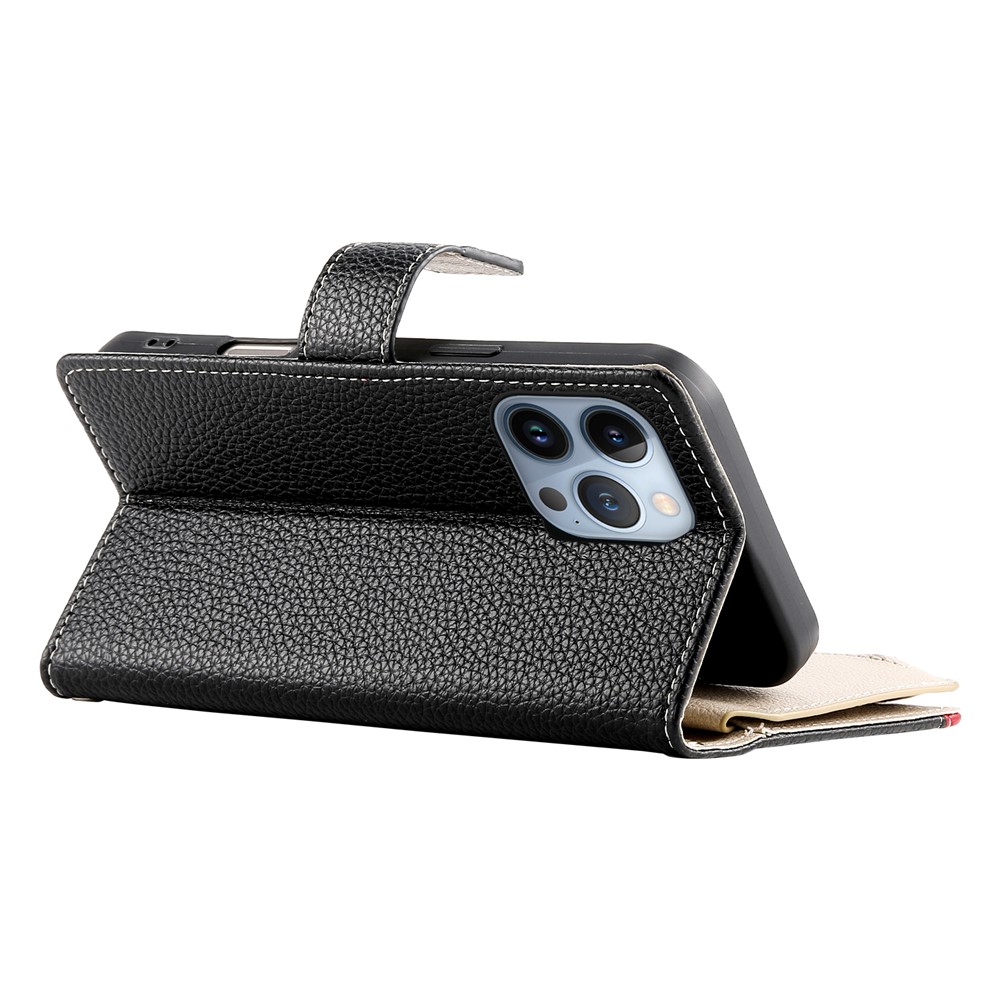 For iPhone 13 Pro Case Zipper Pocket Wallet Color Splicing Leather Flip Phone Cover with Straps - Black