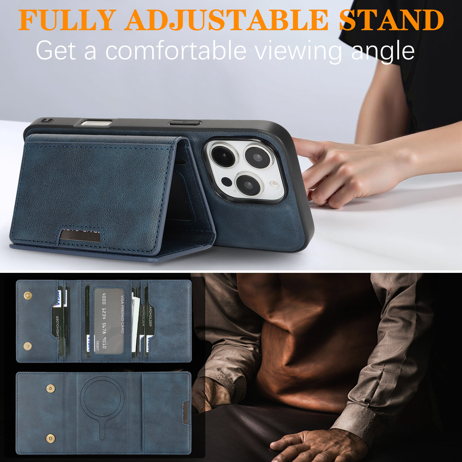 - MagSafe Compatible Supports for MagSafe accessories and wireless charging, featuring a minimalist magnetic leather bi-fold design with card holder functionality.