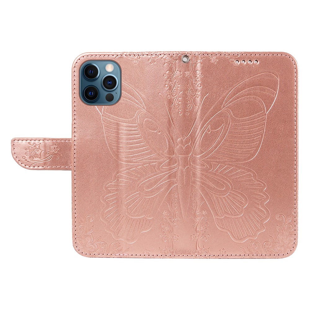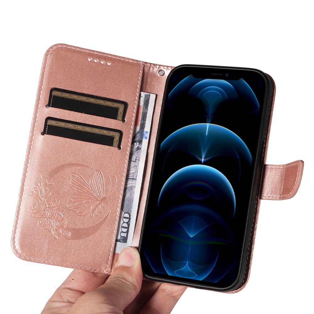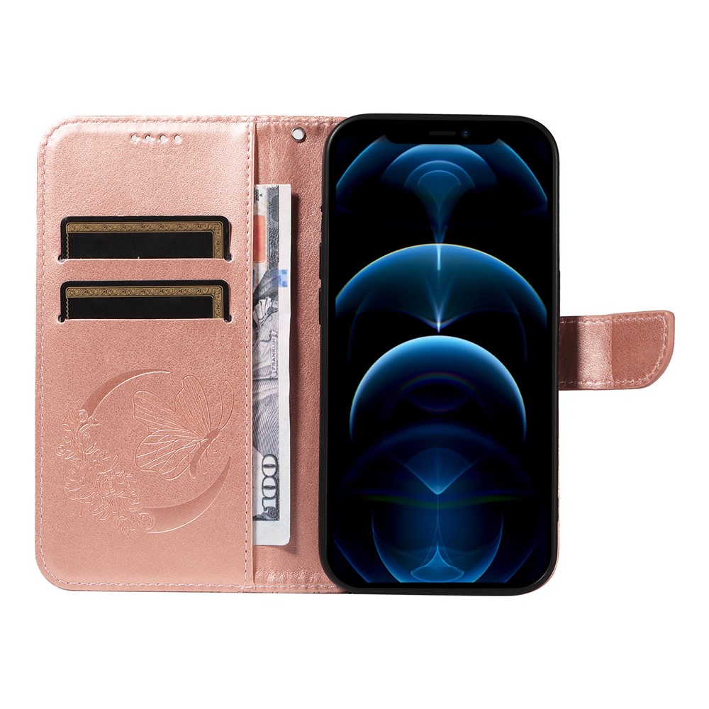 For iPhone 13 Pro Leather Case Butterfly Imprinted Stand Wallet Phone Cover – Rose Gold