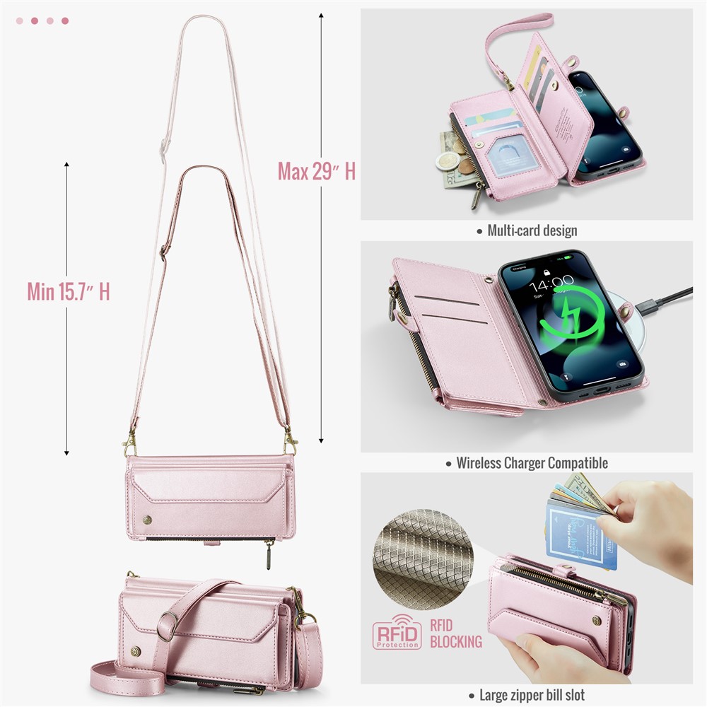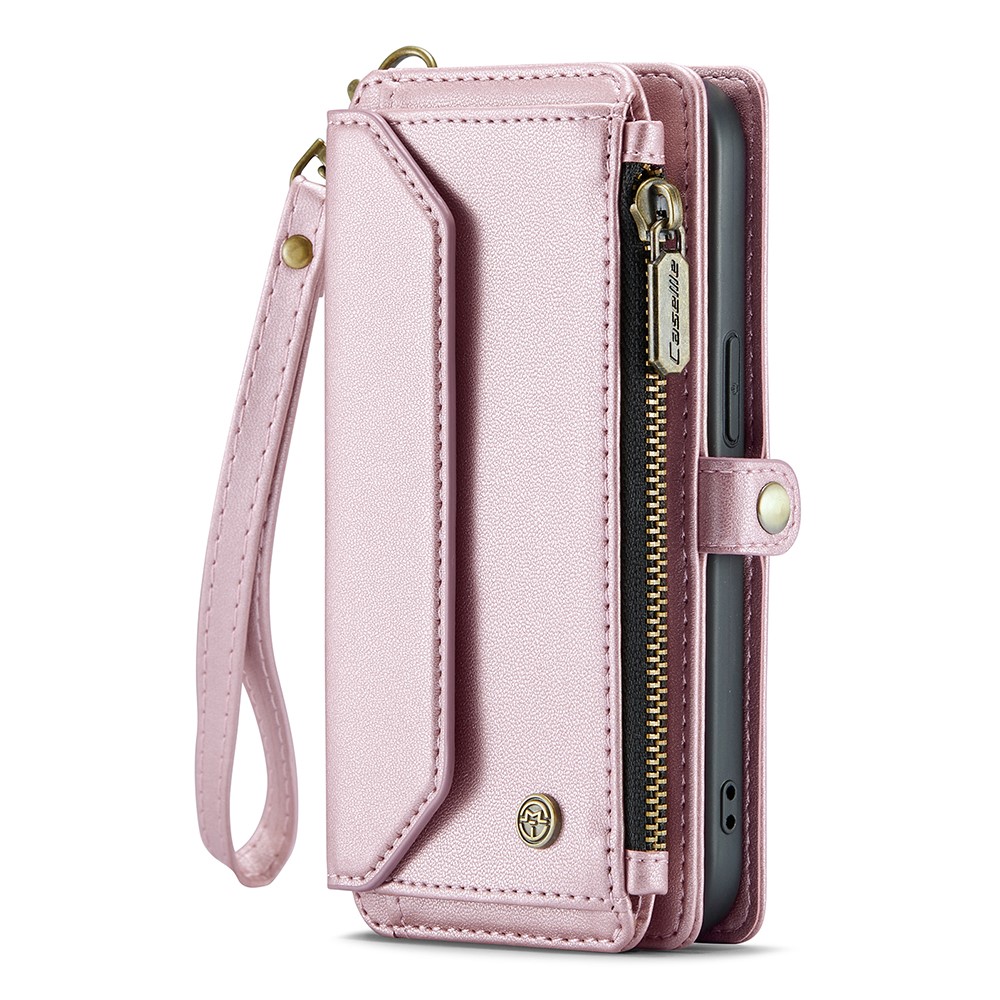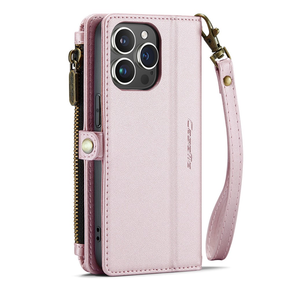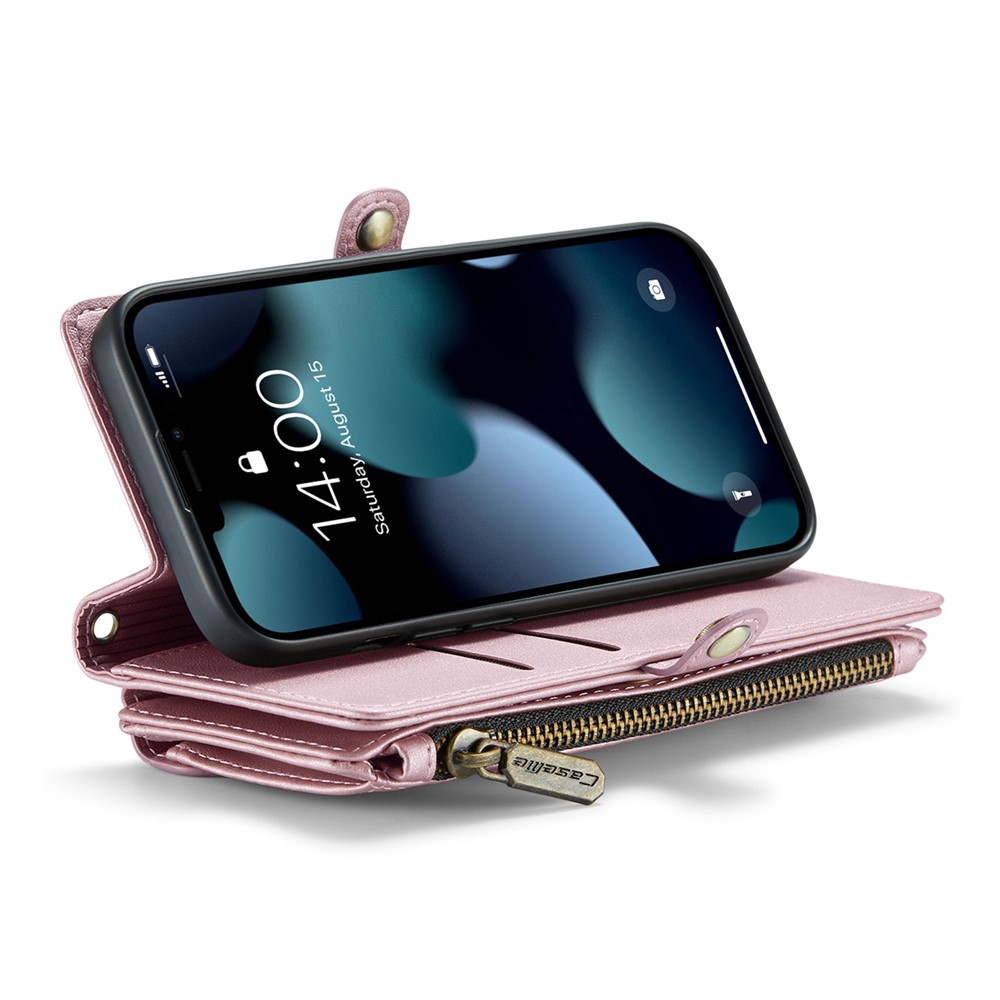 For iPhone 13 Pro Leather Case CASEME C36 Zipper Multiple Card Slots Phone Cover with Straps – Pink
