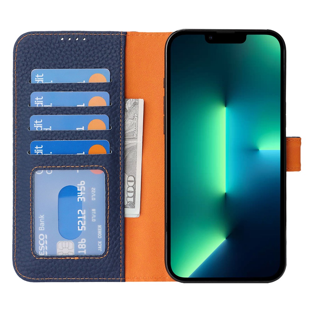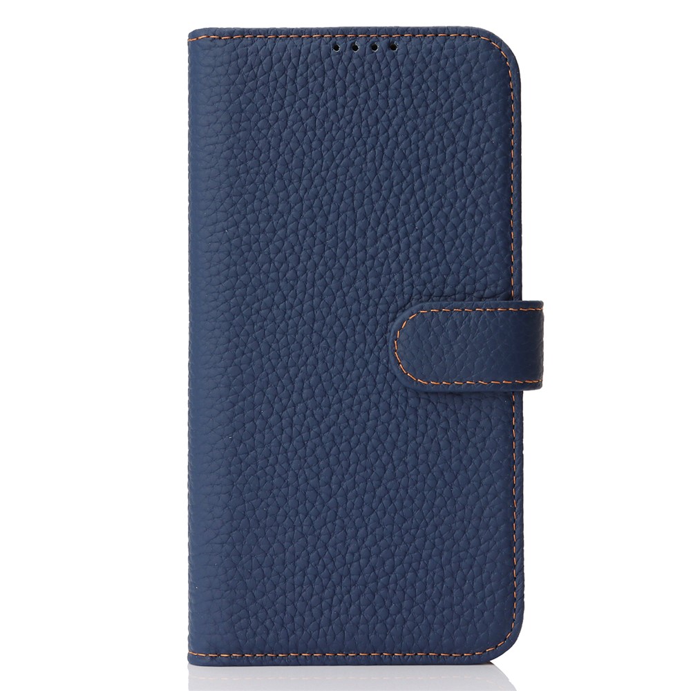 For iPhone 13 Pro Max / 12 Pro Max Stand Case Litchi Texture Genuine Cow Leather Wallet Phone Cover RFID Blocking - Blue $23.92