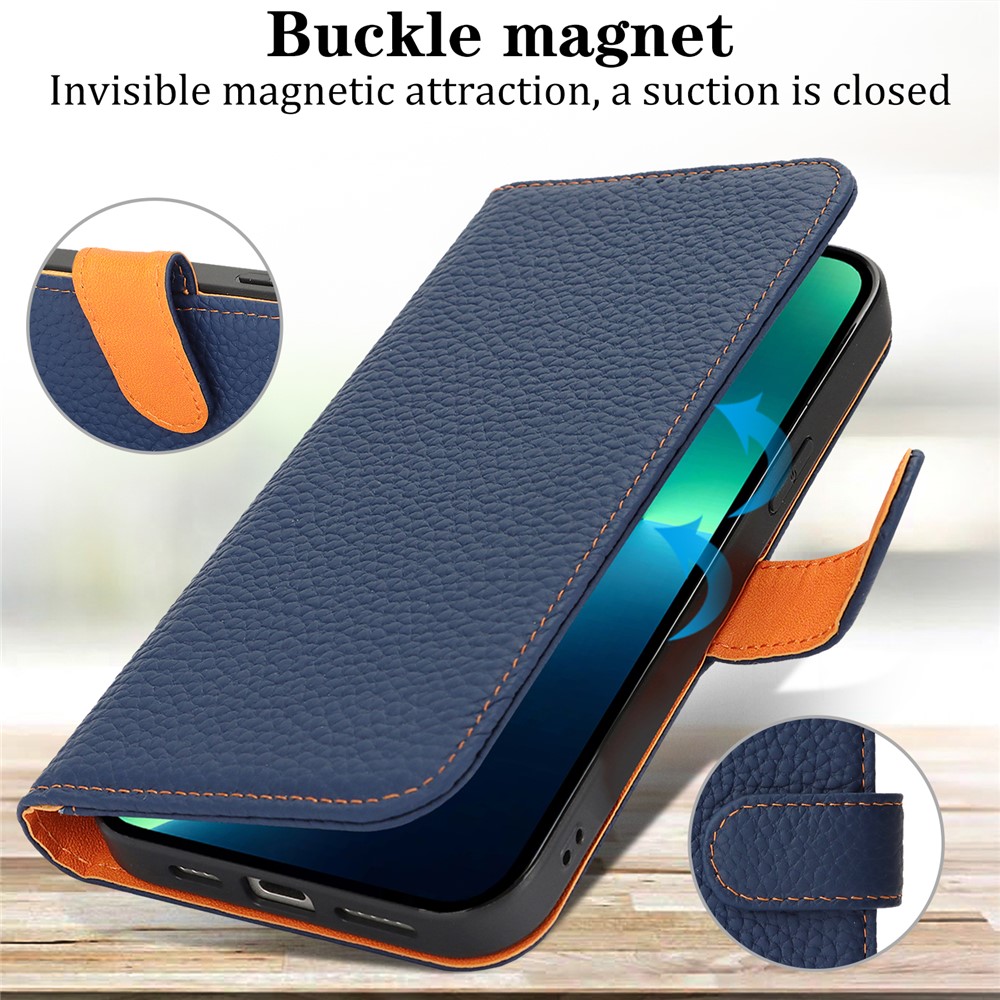 • For iPhone 13 Pro Max  /  12 Pro Max Stand Case Litchi Texture Genuine Cow Leather Wallet Phone Cover RFID Blocking - Black