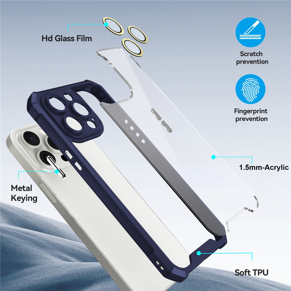 For iPhone 13 Pro Max Case Scratch Resistant Acrylic+TPU Phone Cover with Glass Lens Film – Blue