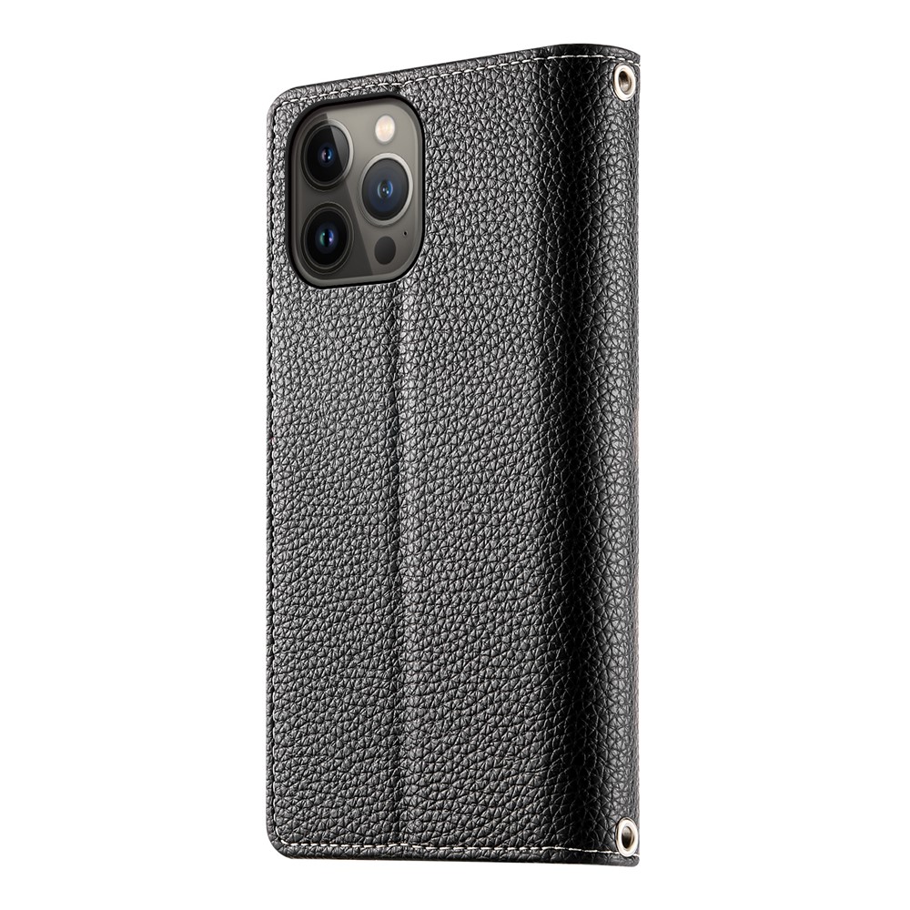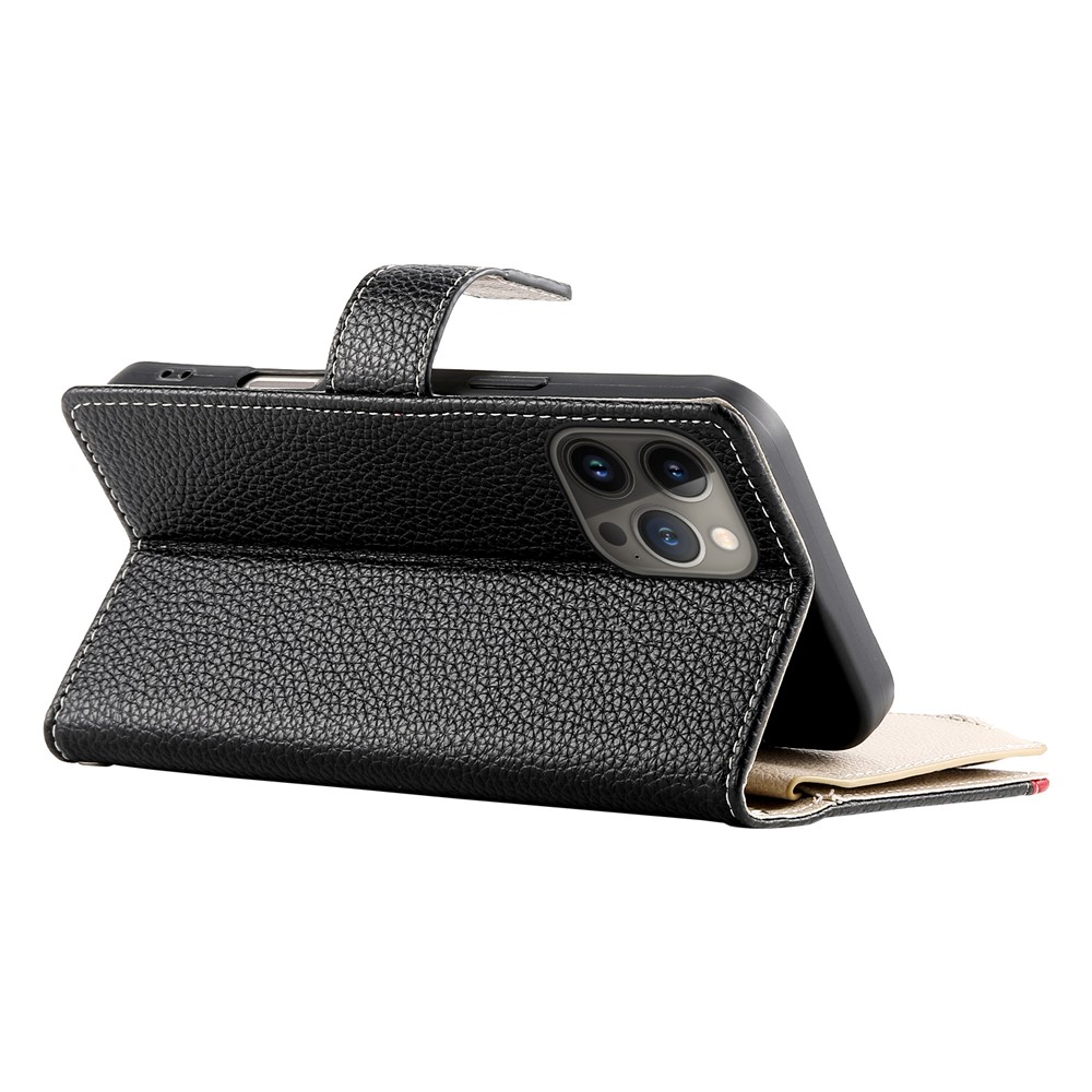 For iPhone 13 Pro Max Case Zipper Pocket Wallet Color Splicing Leather Flip Phone Cover with Straps – Black