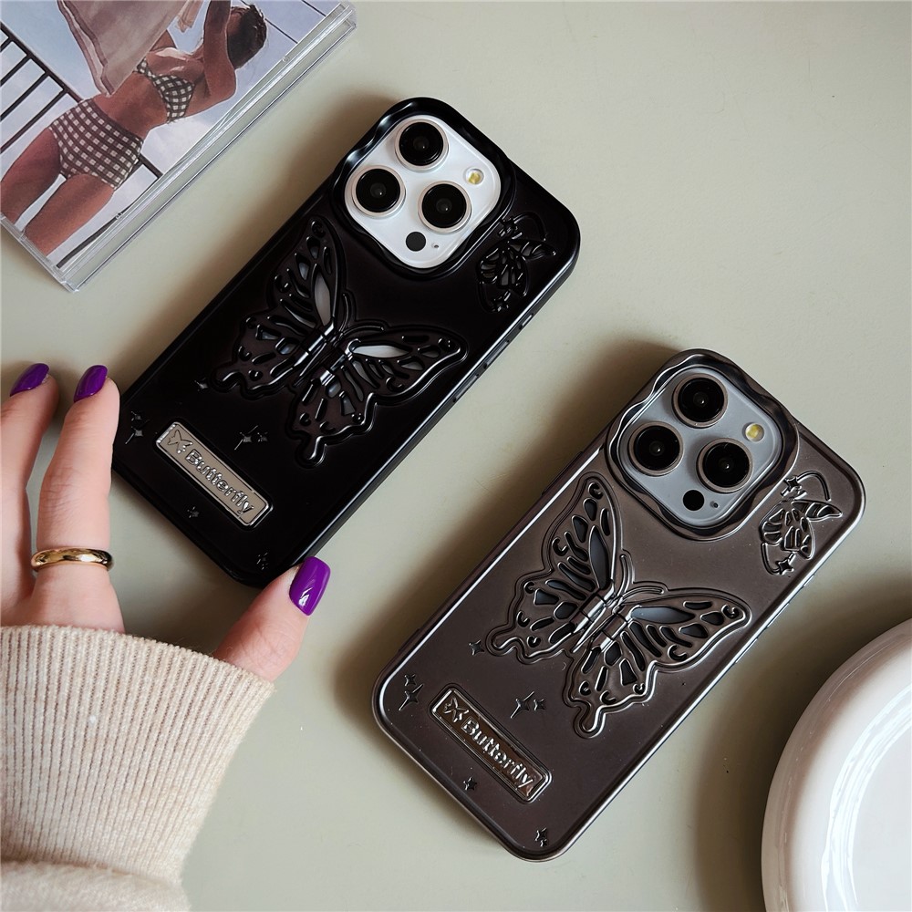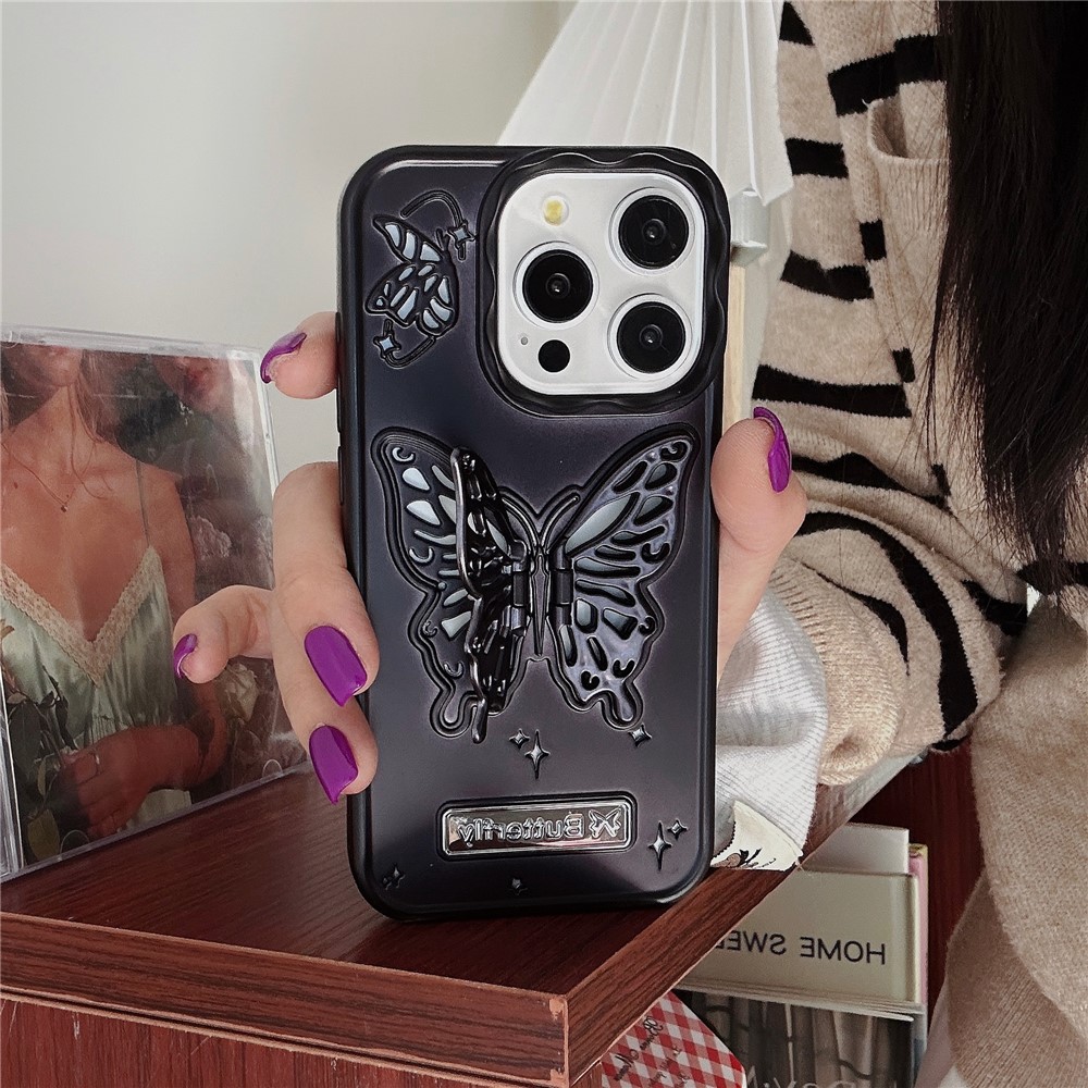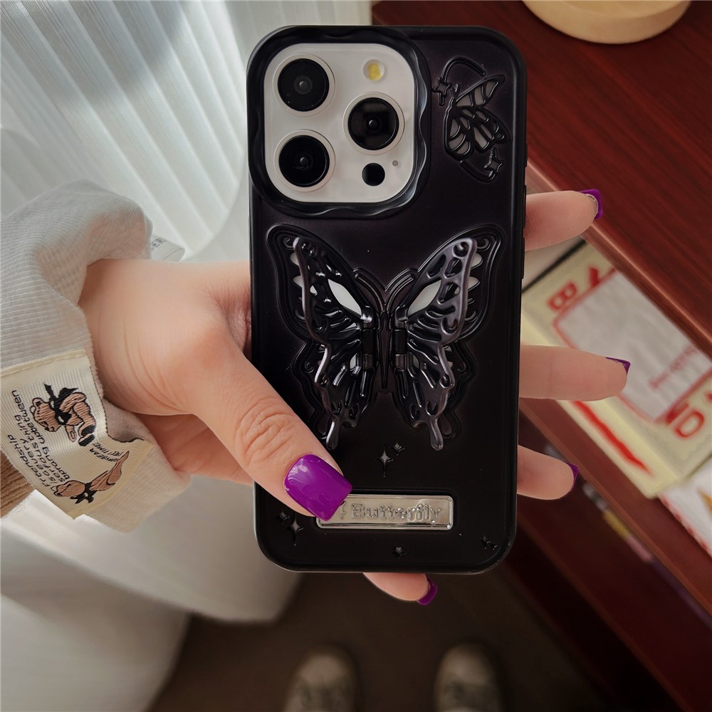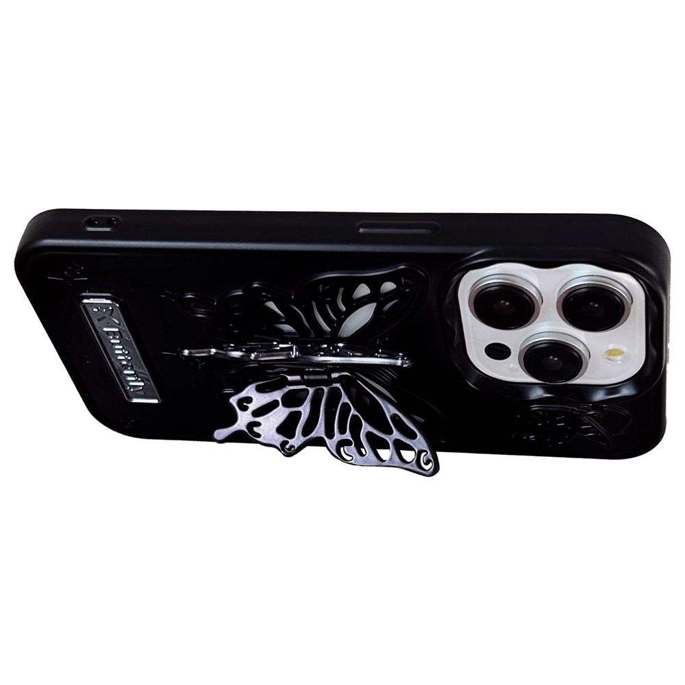 For iPhone 13 Pro TPU Cover Matte Butterfly Design PC Kickstand Cell Phone Shell - Black $15.18