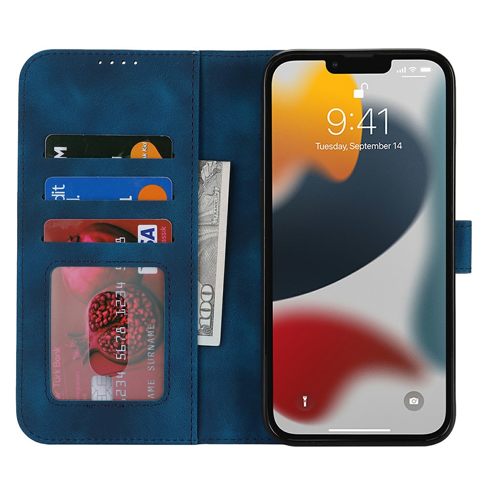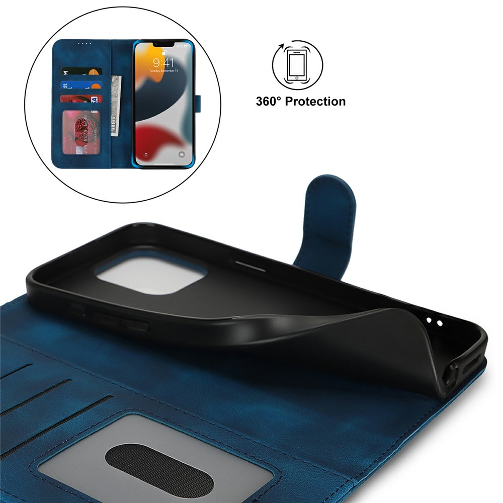 For iPhone 13 Pro Wallet Case Double Folded Edge Skin Touch PU Leather Flip Phone Cover - Blue