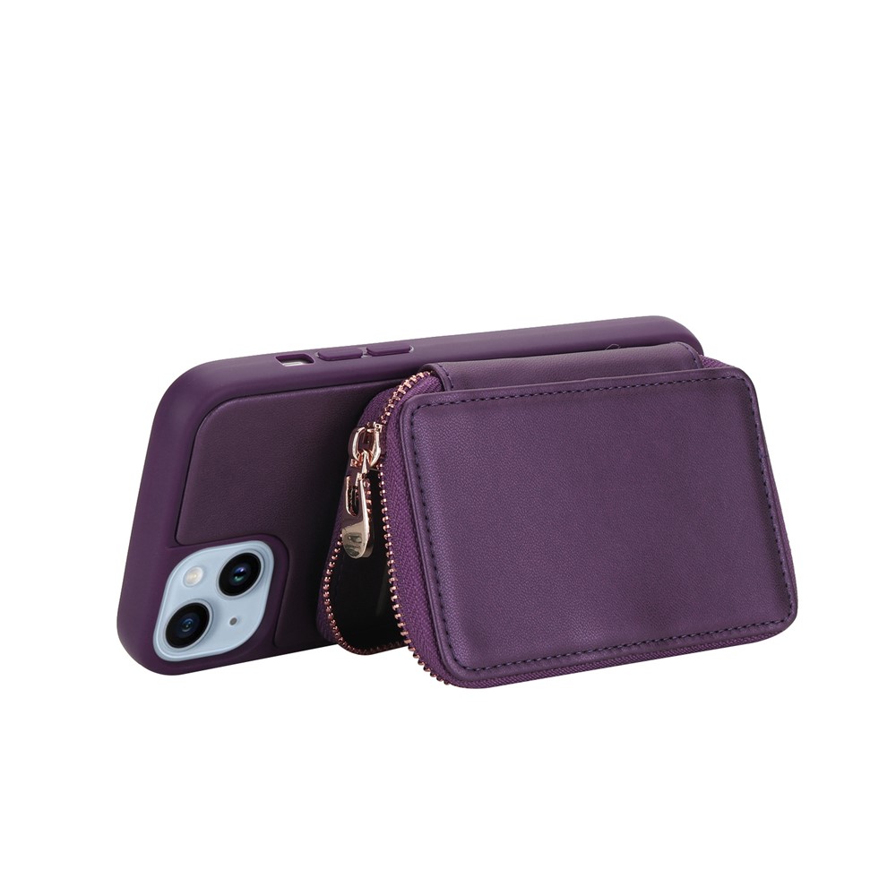 For iPhone 14 / 13 Case RFID Blocking Zipper Wallet Leather + TPU Phone Cover with Shoulder Strap – Dark Purple