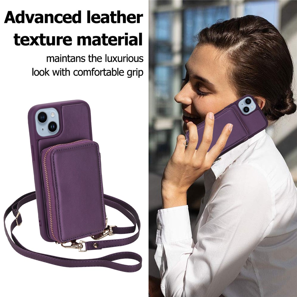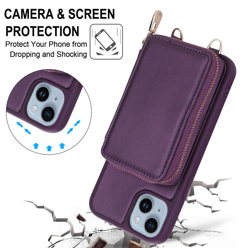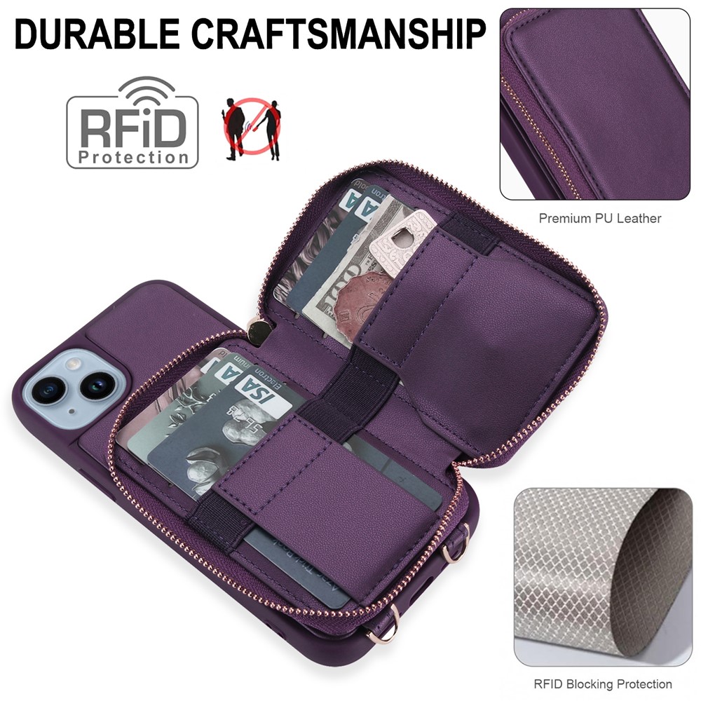 For iPhone 14 / 13 Case RFID Blocking Zipper Wallet Leather + TPU Phone Cover with Shoulder Strap - Dark Purple $20.74