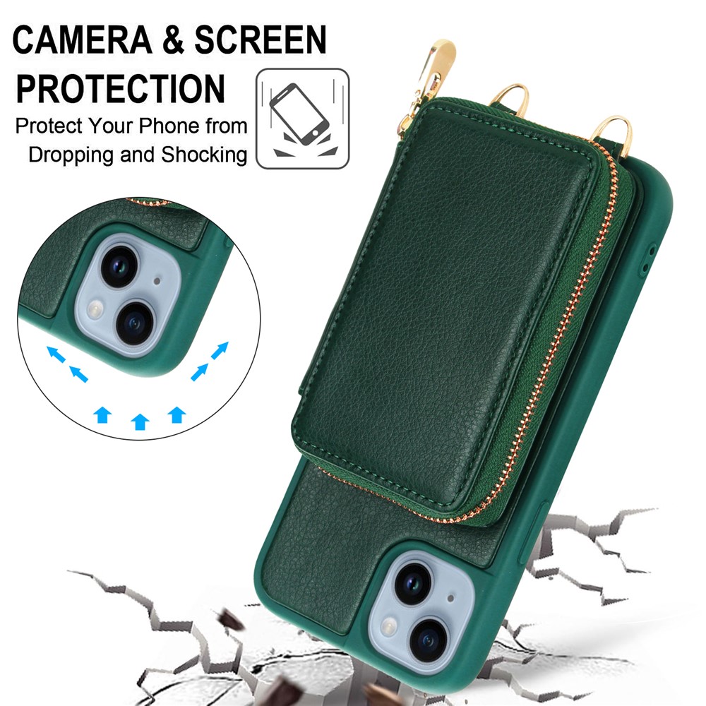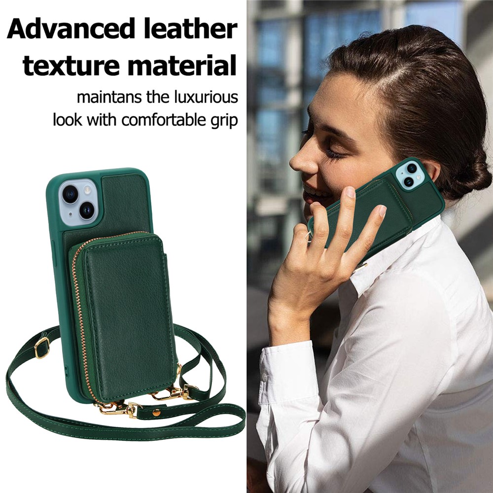 For iPhone 14 / 13 Case RFID Blocking Zipper Wallet Leather + TPU Phone Cover with Shoulder Strap - Green $20.74