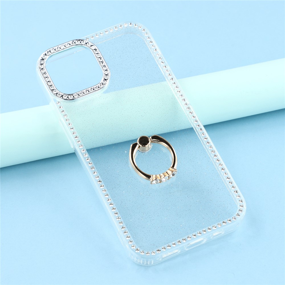 For iPhone 14 / 13 Case with Ring Kickstand Rhinestone Edge TPU + PC IMD Phone Cover – Glitter Transparent