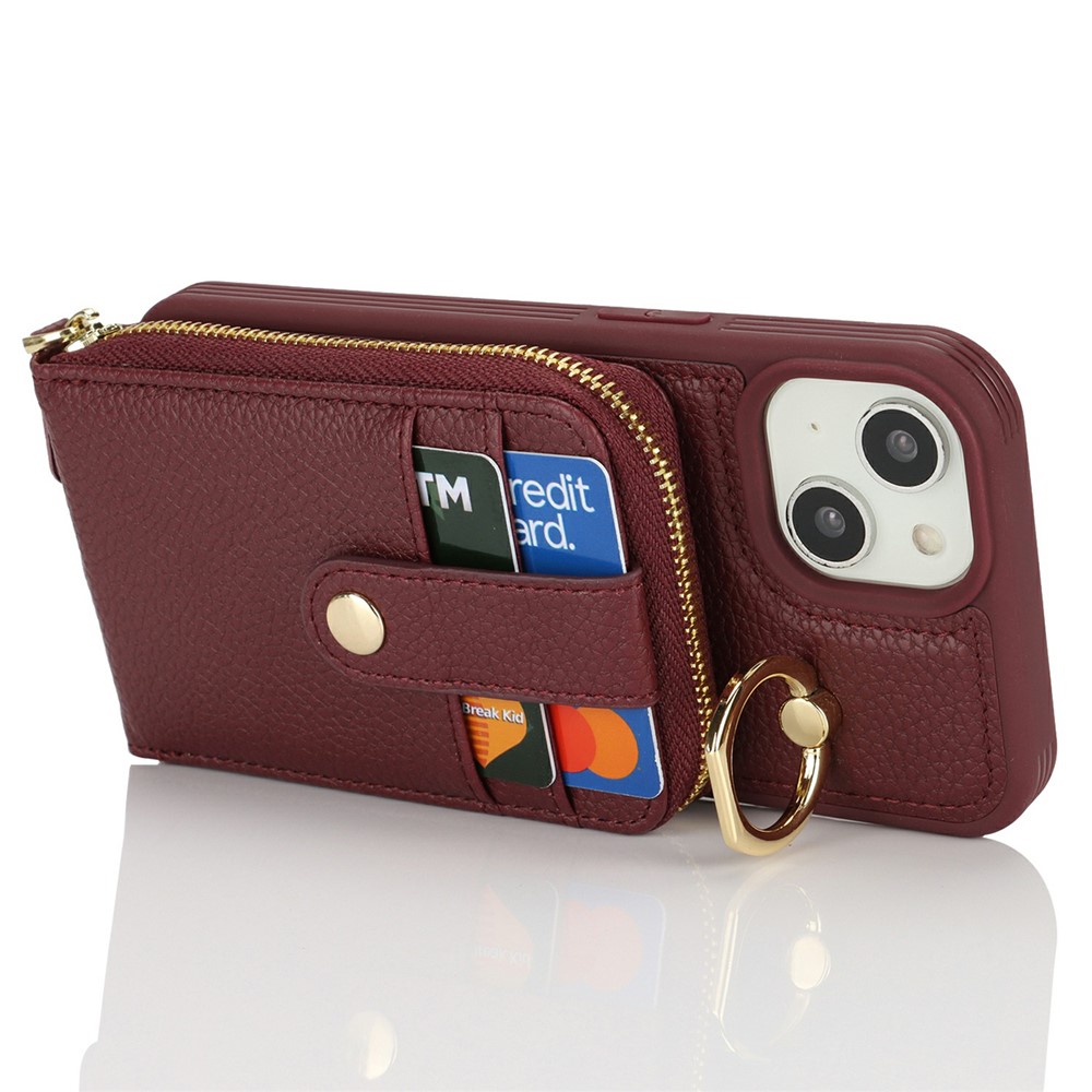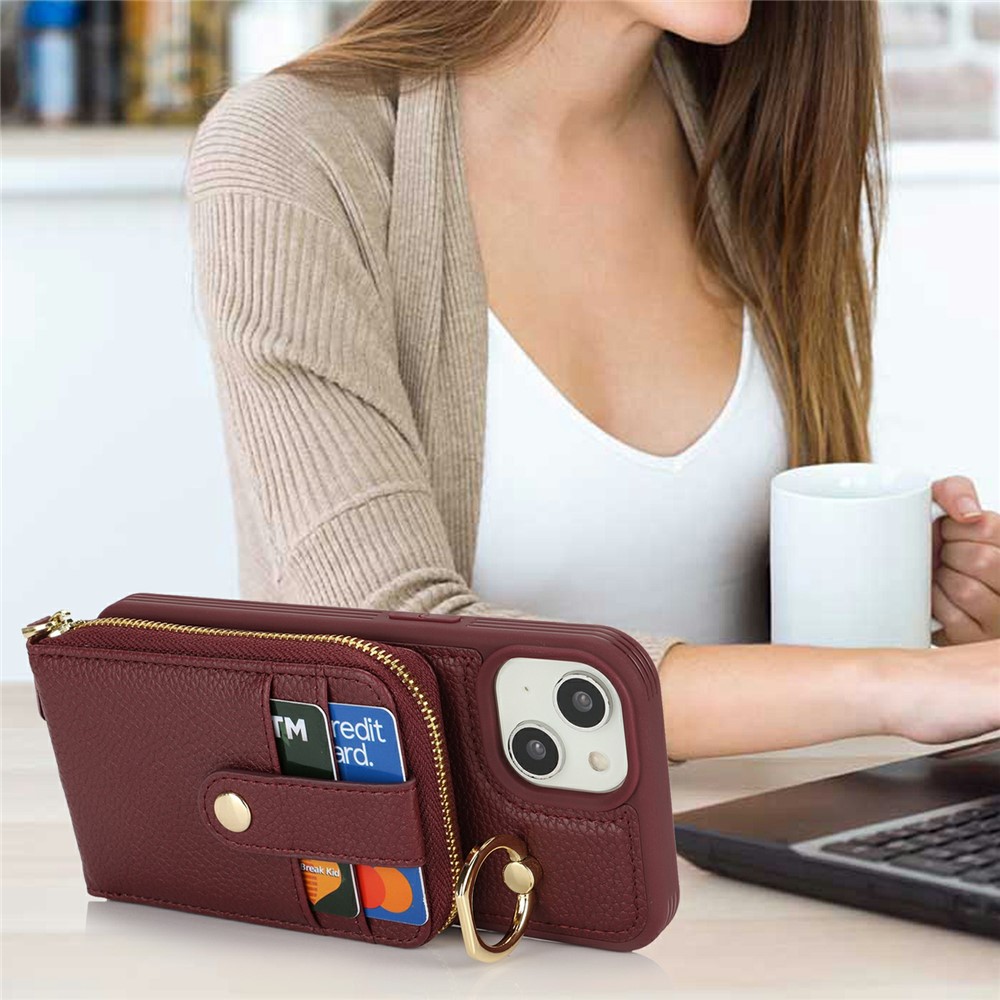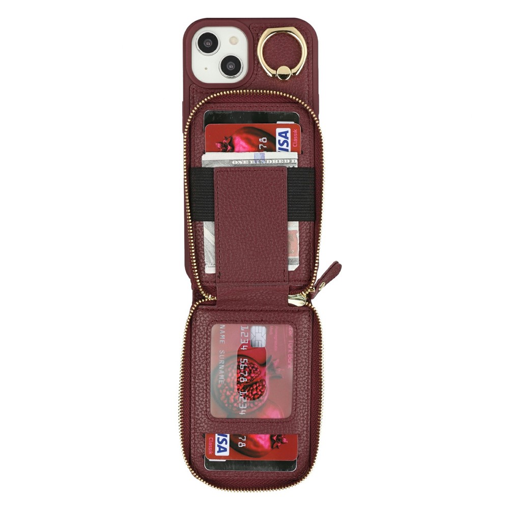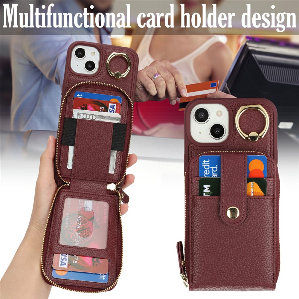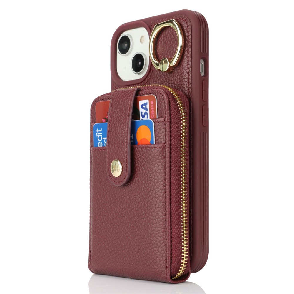 For iPhone 14 / 13 Case with Zipper Pouch / Ring Kickstand / Strap Litchi Texture PU + TPU Phone Cover - Wine Red