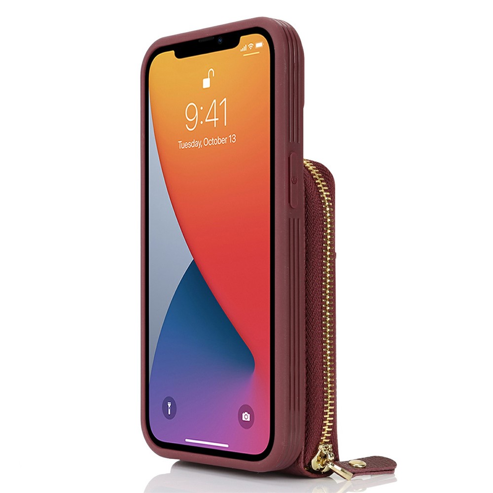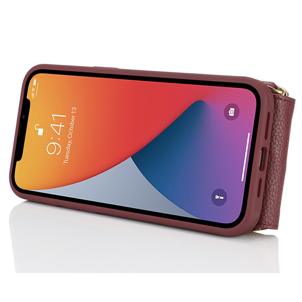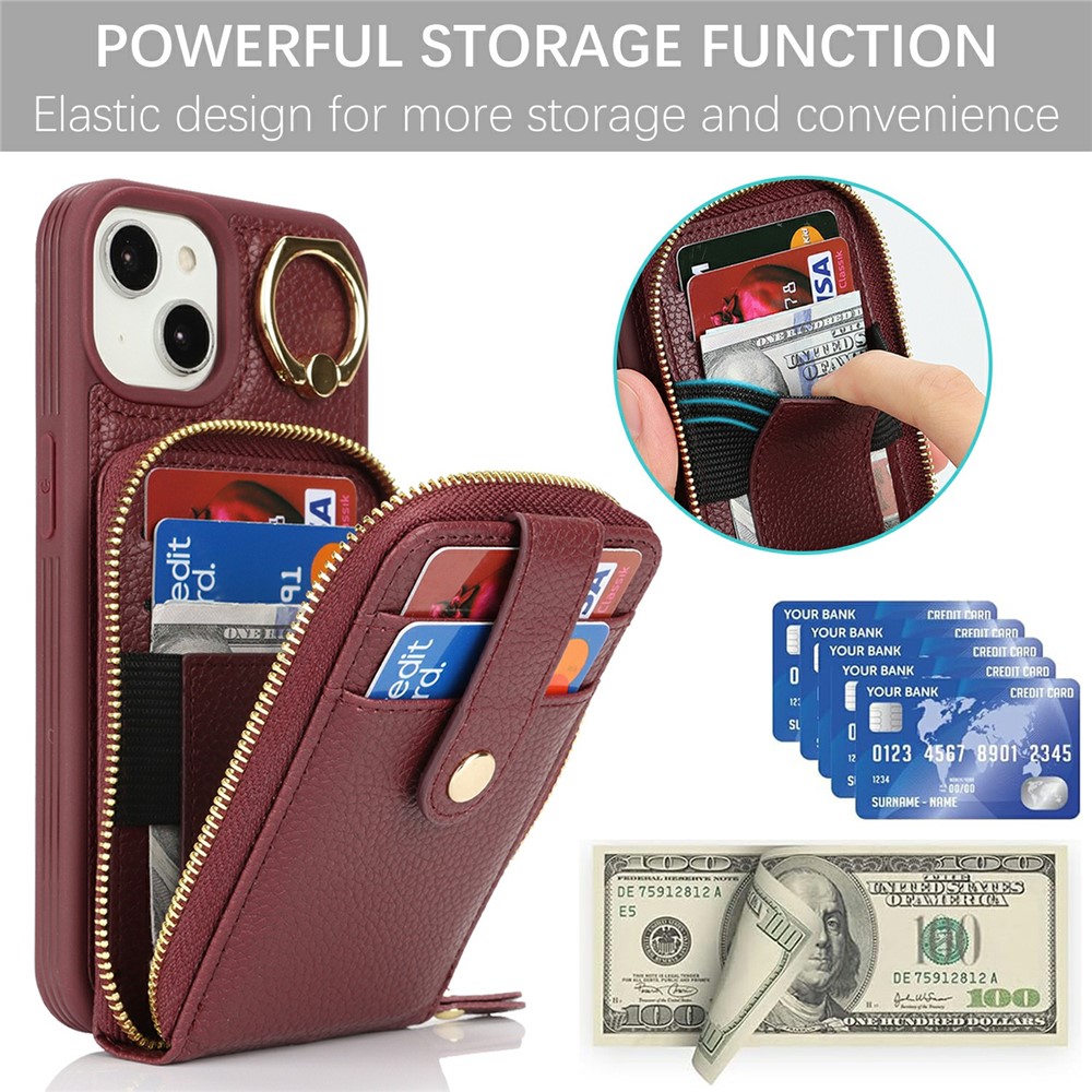 For iPhone 14 / 13 Case with Zipper Pouch / Ring Kickstand / Strap Litchi Texture PU + TPU Phone Cover - Wine Red $20.91