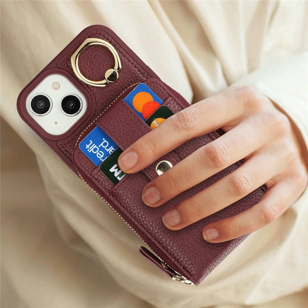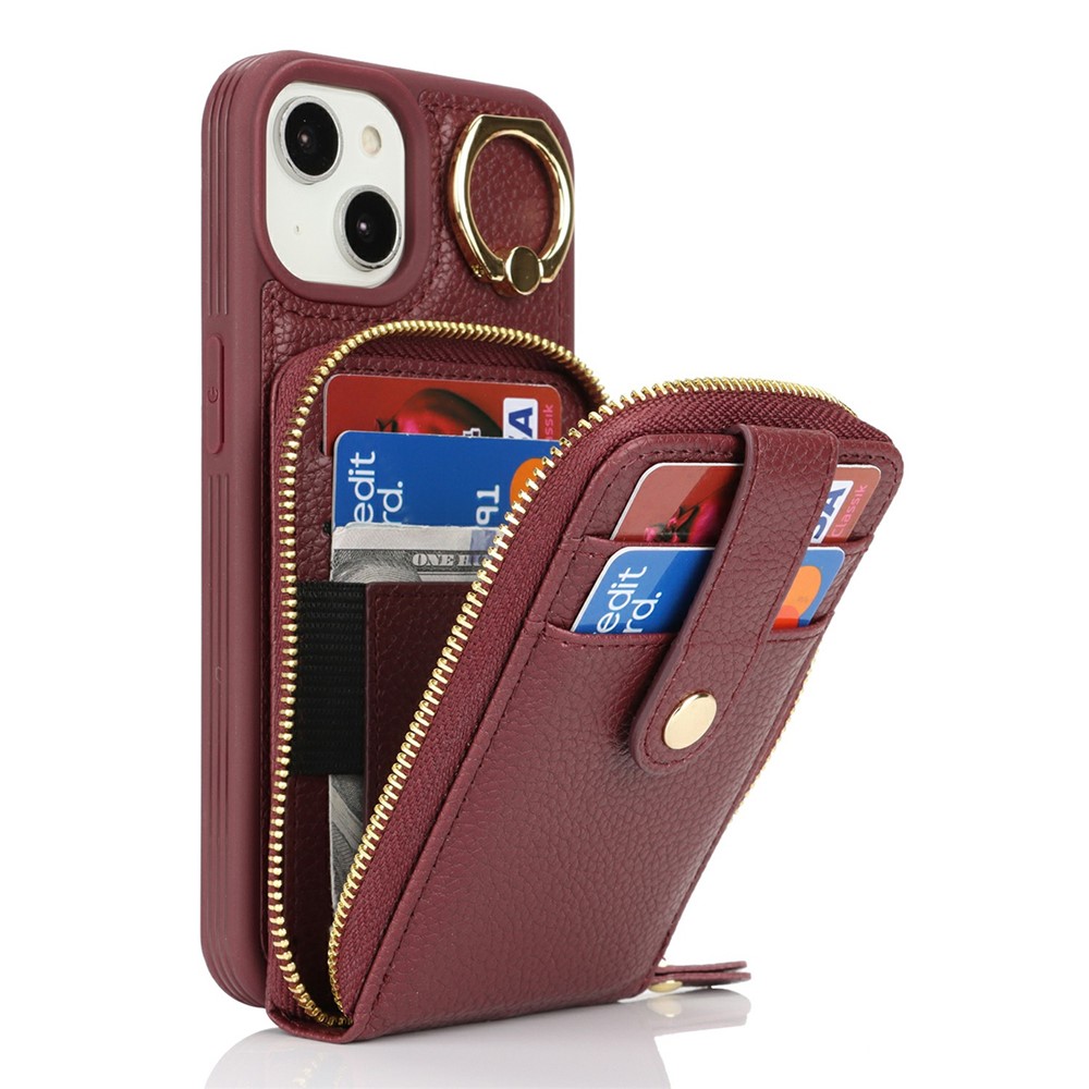 For iPhone 14 / 13 Case with Zipper Pouch / Ring Kickstand / Strap Litchi Texture PU + TPU Phone Cover – Wine Red